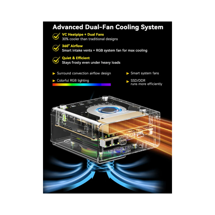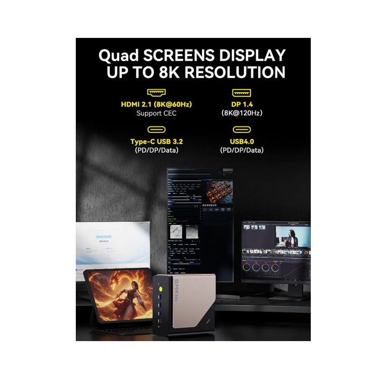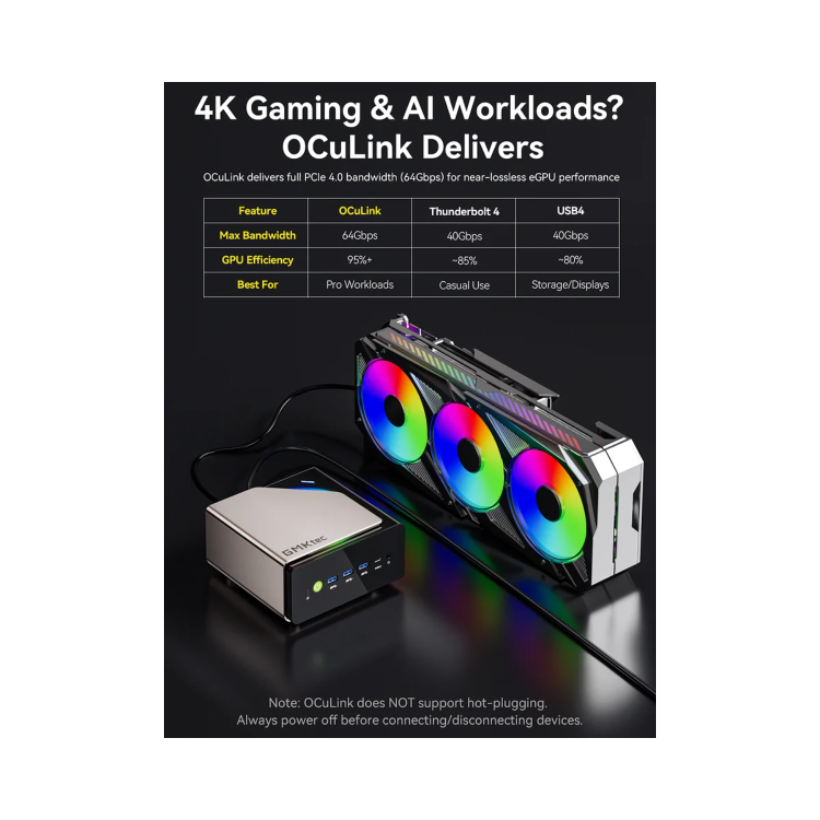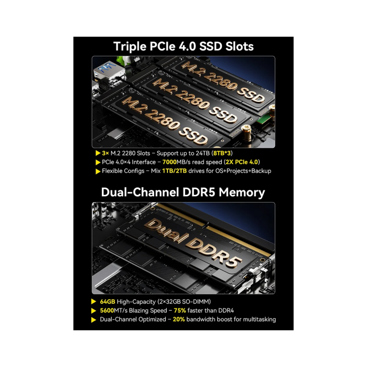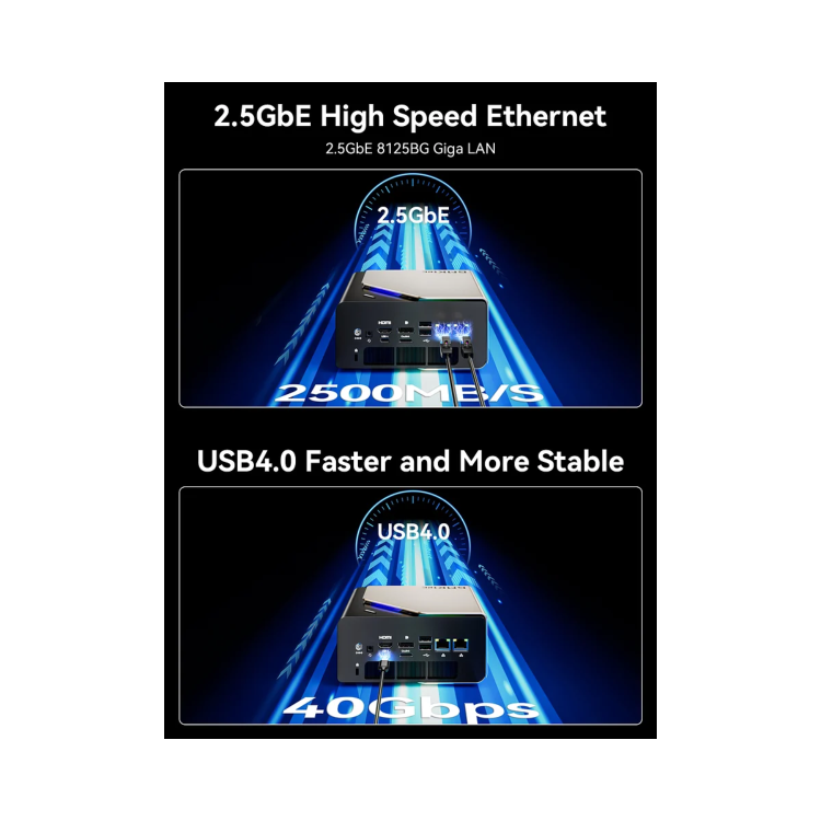 Equipped with a staggering 64GB of RAM, the GMK-EVOT1-01 is built for ultimate multitasking. Switch effortlessly between multiple applications, handle large datasets, and run memory-intensive software without interruptions. This massive memory capacity guarantees that your system keeps up with your workflow, no matter how demanding it gets.