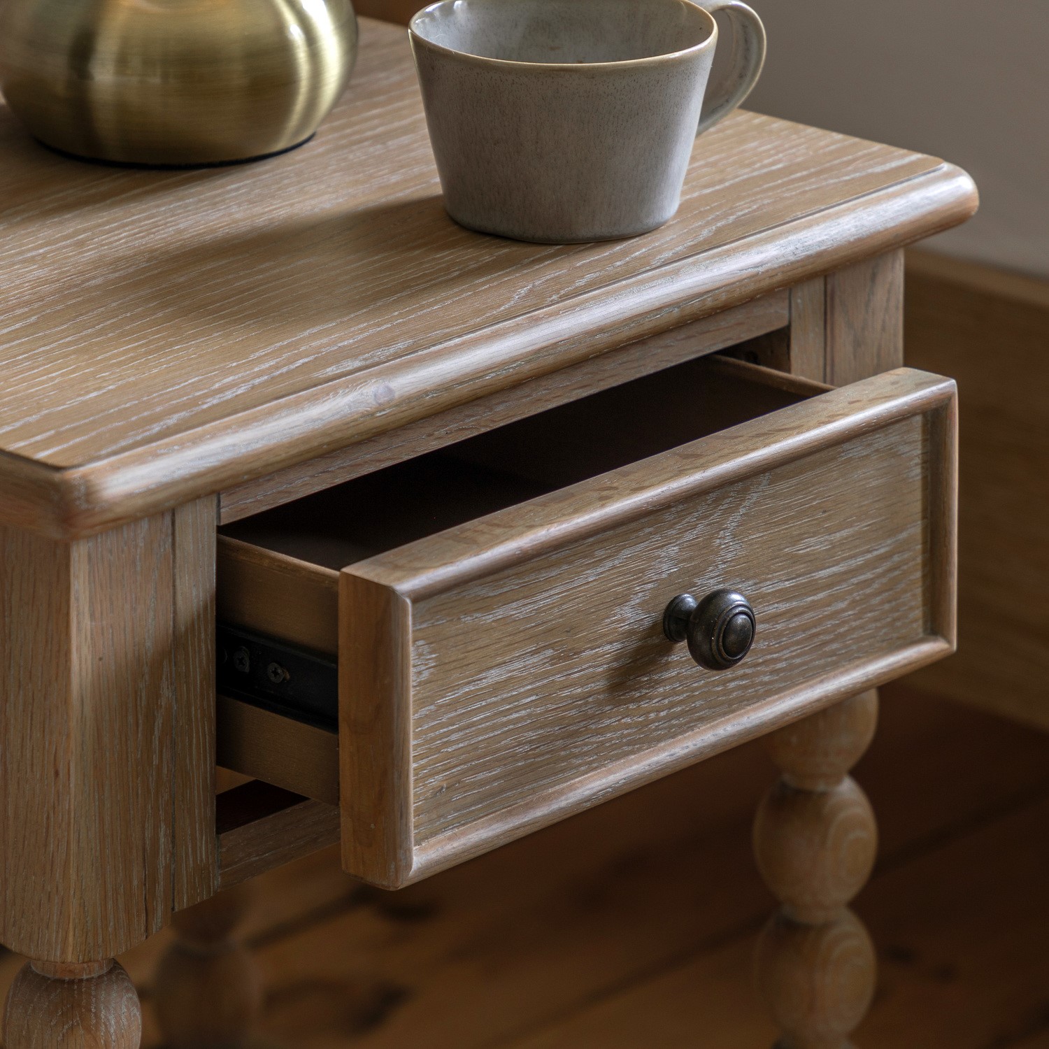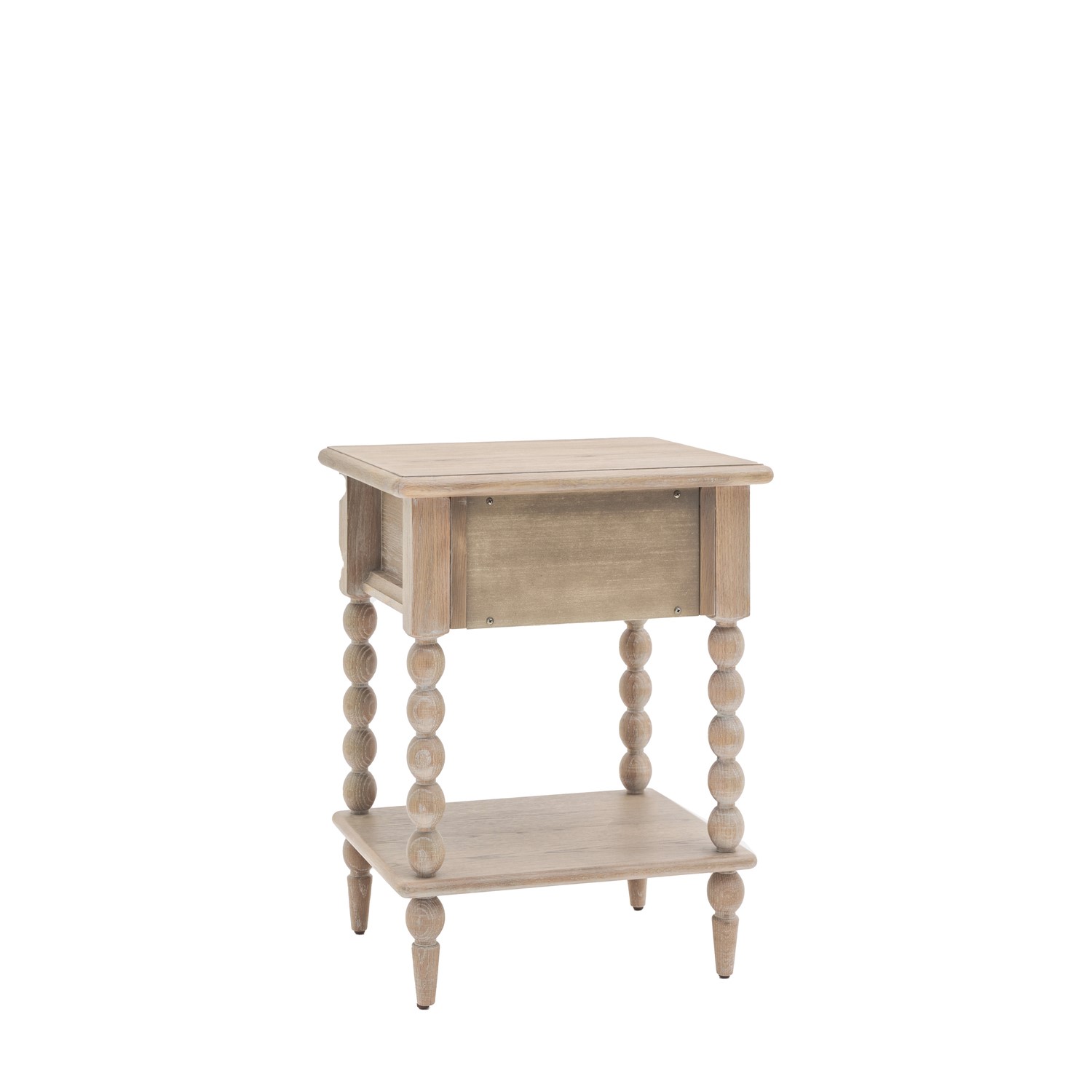 This 1-drawer bedside combines craftsmanship and functionality in a compact design. Featuring intricate hand-turned bobbin detailing and crafted from high-quality wood with a subtle lime-wash finish for a soft, natural look, it includes a practical drawer, making it an elegant and versatile addition to any bedroom.
