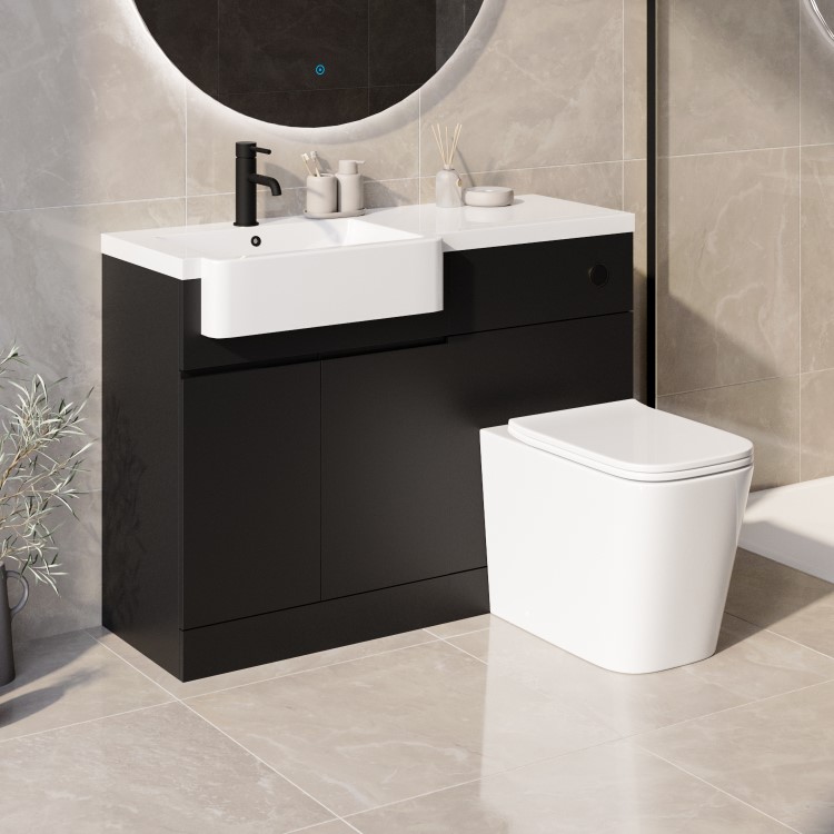 Transform your bathroom with the Bali left hand 1100mm toilet and sink unit in matt black. Not only will unsightly piping be hidden, but with its minimalist handleless design and matt finish, it will give your bathroom a final modern touch. The cabinet provides storage for your all of your bathroom supplies, whilst the resin semi-recessed basin with an integrated worktop, provides extra countertop storage space for your daily essentials. The unit requires no assembly, secure the basin and choose your desired basin mono mixer tap to complete your toilet and sink unit. The unit will be assembled with the basin on the left hand side to utilise your bathroom layout. Please note, this unit comes with a matt black push button and overflow cover, however the toilet seat fittings and door hinges are chrome.