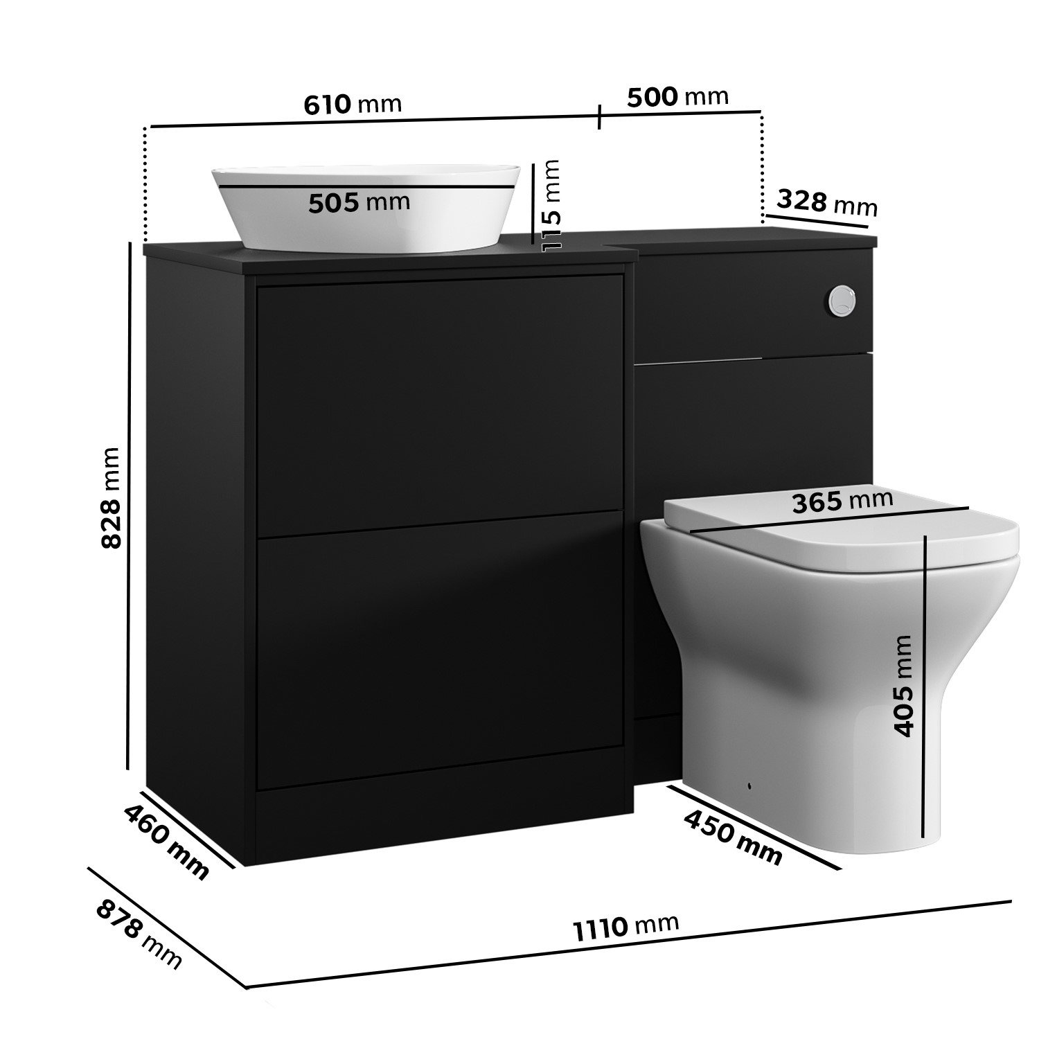 - Overall Dimensions Including Toilet: H 943mm x W 1110mm x D878mm