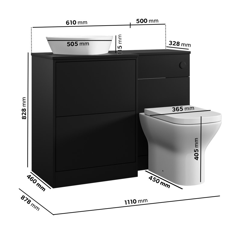Enhance your bathroom with this left-hand modern matt black toilet and sink unit with matt black push button, designed with the sink unit conveniently positioned to the left of the toilet. The unit has 2 push to open drawers with plenty of room to store your bathroom essentials. The drawer opening distance is a generous 255mm. The unit has no pre-drilled holes for added flexibility.