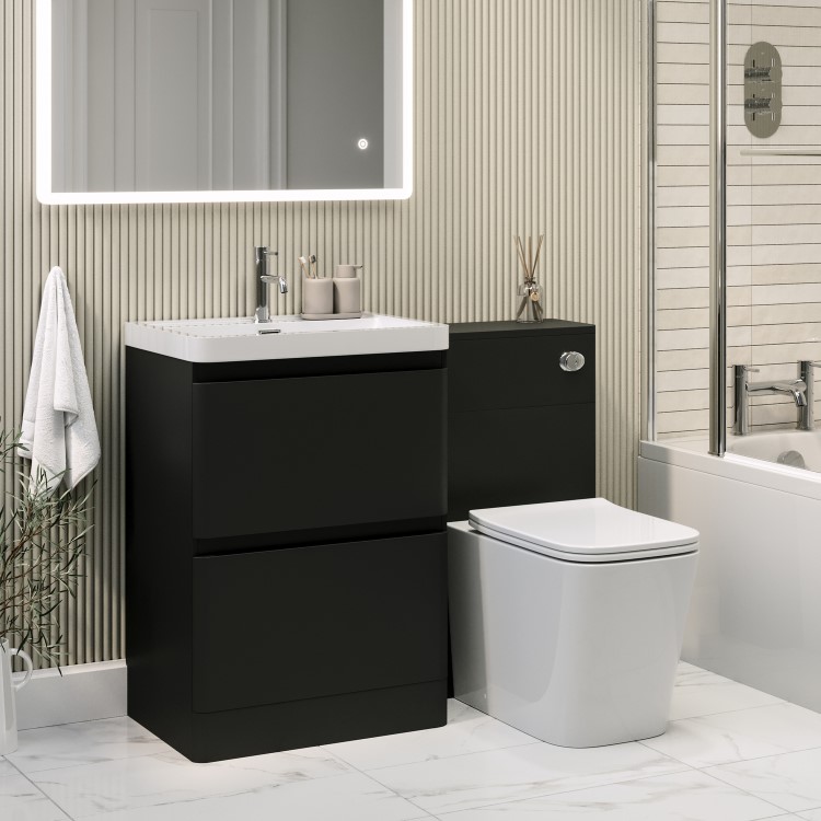 This pre-assembled set ensures a quick and stress-free installation. The toilet unit is designed to match the Pendle matt black range, ensuring a cohesive look throughout your bathroom. It comes complete with a coordinating ceramic back-to-wall toilet in a sleek square shape and glossy white finish. The rimless bowl enhances hygiene and makes cleaning easier, while the soft-close seat with a quick-release function adds convenience and comfort. A concealed cistern with a dual flush system offers efficient water use, and the chrome push button flush plate provides a refined finishing touch that elevates the overall design. Whether you're renovating or refreshing, the Pendle unit delivers a smart, space-saving solution without compromising on style. While the unit is water-resistant, it isn't waterproof so we recommend wiping away any splashes or spills to help keep it looking its best and performing well over time.