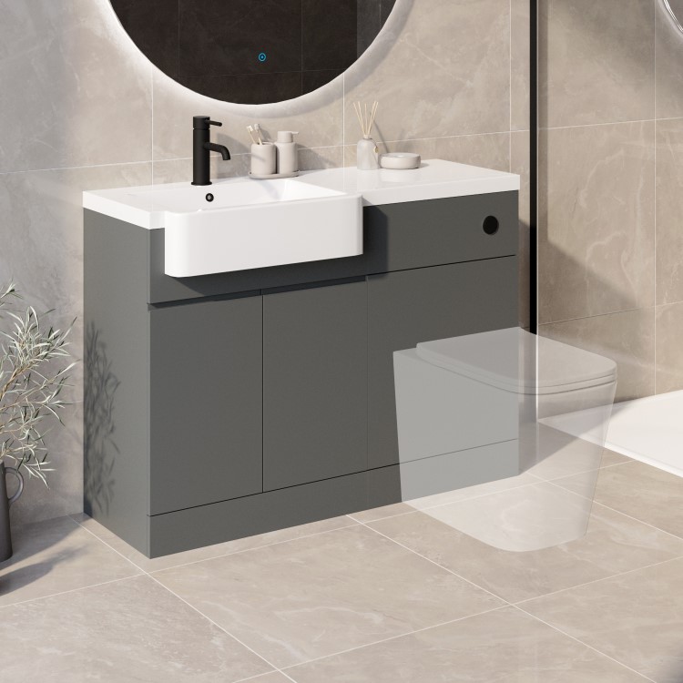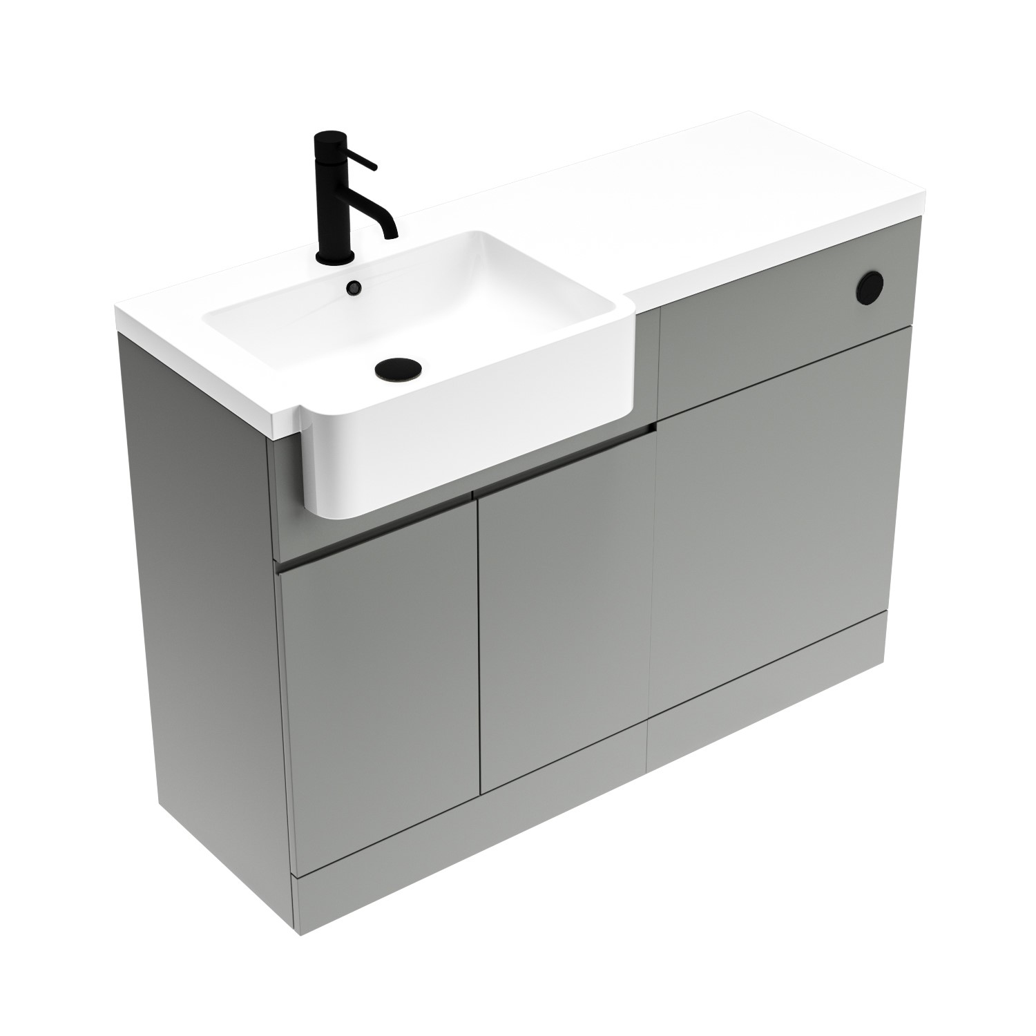 Transform your bathroom with the Bali left hand 1100mm toilet and sink unit in matt grey. Not only will unsightly piping be hidden, but with its minimalist handleless design and matt finish, it will give your bathroom a final modern touch. The cabinet provides storage for your all of your bathroom supplies, whilst the resin semi-recessed basin with an integrated worktop, provides extra countertop storage space for your daily essentials.