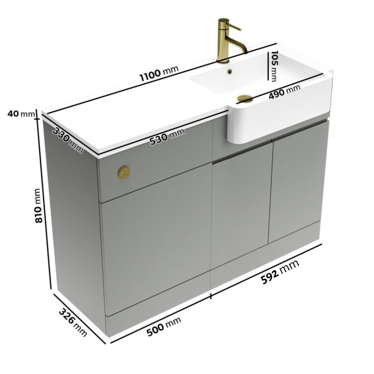 Transform your bathroom with the Bali right hand 1100mm toilet and sink unit in matt grey. Not only will unsightly piping be hidden, but with its minimalist handleless design and matt finish, it will give your bathroom a final modern touch. The cabinet provides storage for your all of your bathroom supplies, whilst the resin semi-recessed basin with an integrated worktop, provides extra countertop storage space for your daily essentials. The unit requires no assembly, secure the basin and choose your desired basin mono mixer tap to complete your toilet and sink unit. The unit will be assembled with the basin on the right hand side to utilise your bathroom layout. Please note, this unit comes with a brushed brass push button and overflow cover, however the toilet seat fittings are white and door hinges are chrome.