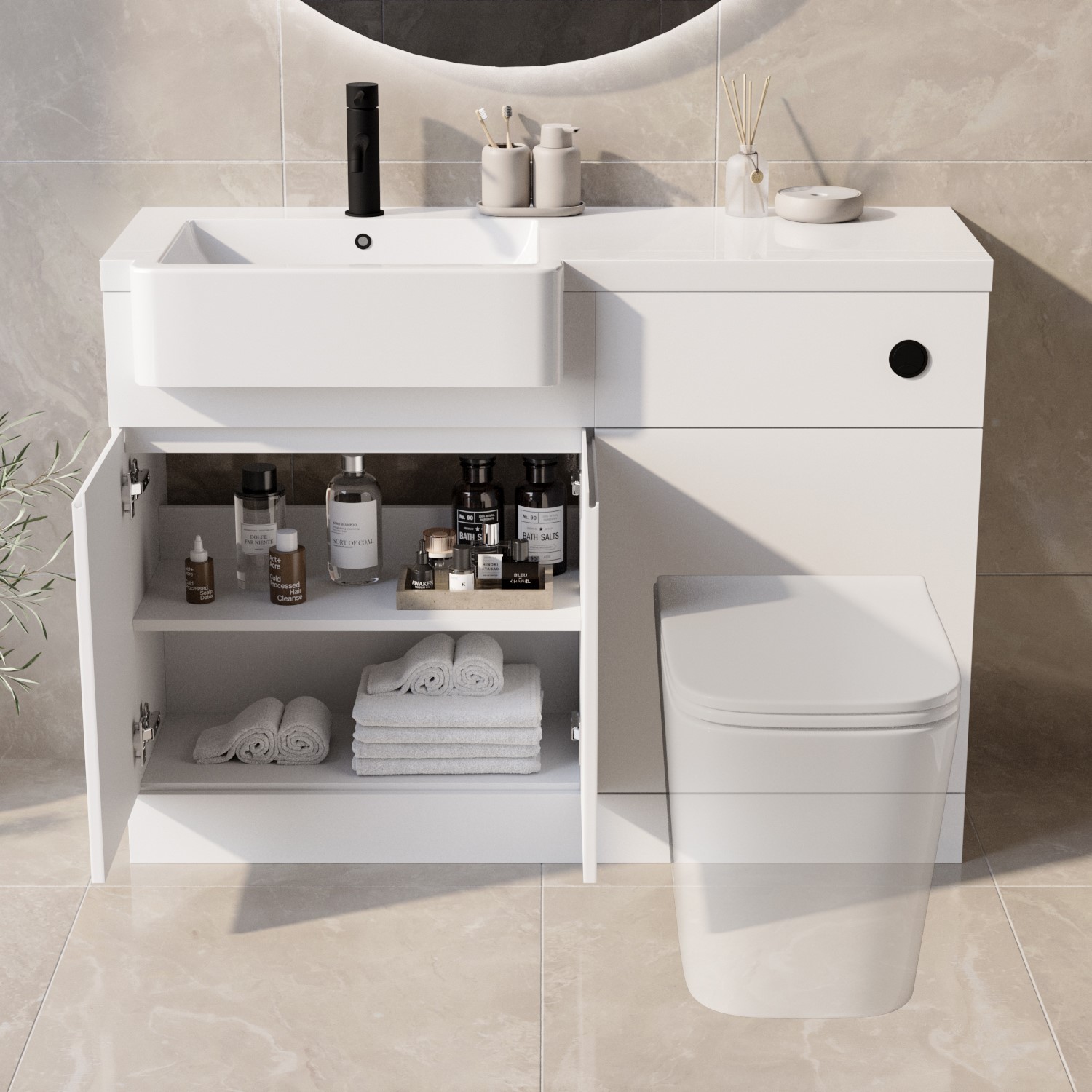All-in-One Space-Saving Design: Combines toilet unit, cistern, basin, and vanity unit in a single compact setup – perfect for small bathrooms, ensuites, or cloakrooms.