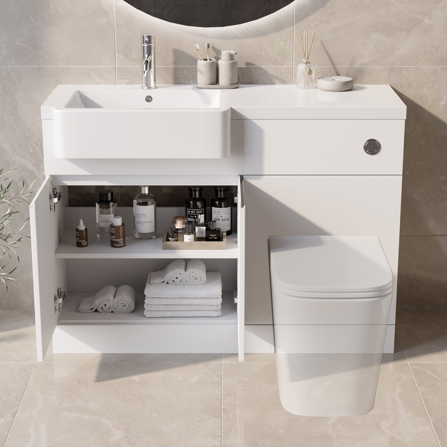 All-in-One Space-Saving Design: Combines toilet unit, cistern, basin, and vanity unit in a single compact setup – perfect for small bathrooms, ensuites, or cloakrooms.