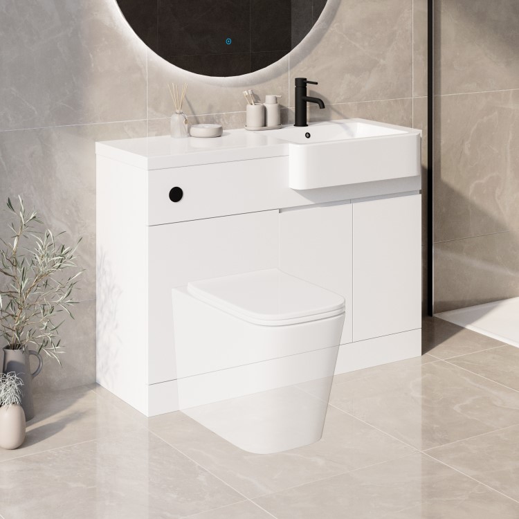Transform your bathroom with the Bali right hand 1100mm toilet and sink unit in matt white. Not only will unsightly piping be hidden, but with its minimalist handleless design and matt finish, it will give your bathroom a final modern touch. The cabinet provides storage for your all of your bathroom supplies, whilst the resin semi-recessed basin with an integrated worktop, provides extra countertop storage space for your daily essentials.