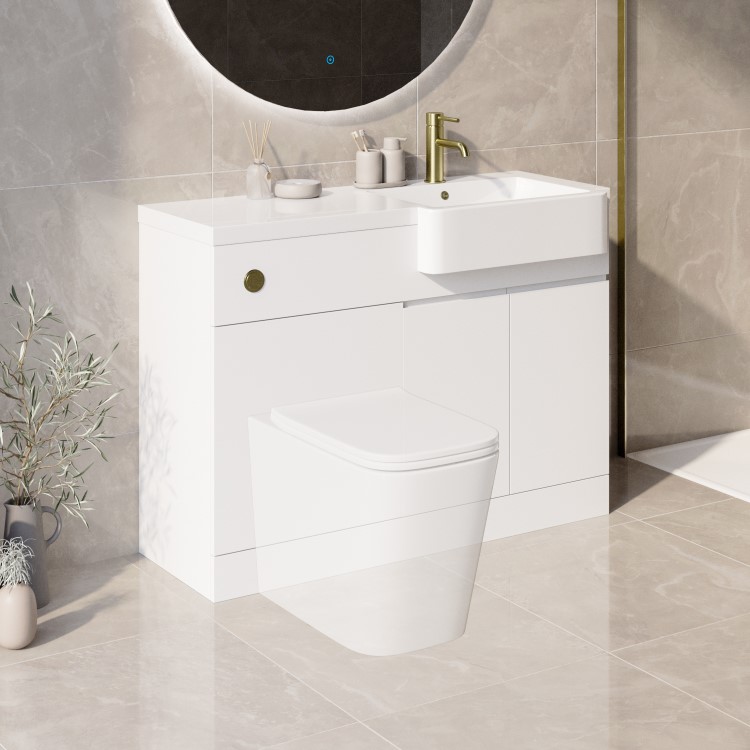 Transform your bathroom with the Bali right hand 1100mm toilet and sink unit in matt white. Not only will unsightly piping be hidden, but with its minimalist handleless design and matt finish, it will give your bathroom a final modern touch. The cabinet provides storage for your all of your bathroom supplies, whilst the resin semi-recessed basin with an integrated worktop, provides extra countertop storage space for your daily essentials.