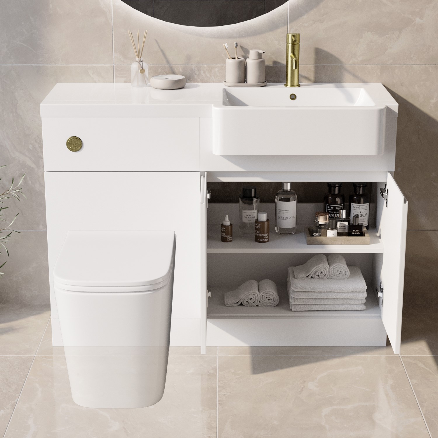 All-in-One Space-Saving Design: Combines toilet unit, cistern, basin, and vanity unit in a single compact setup – perfect for small bathrooms, ensuites, or cloakrooms.