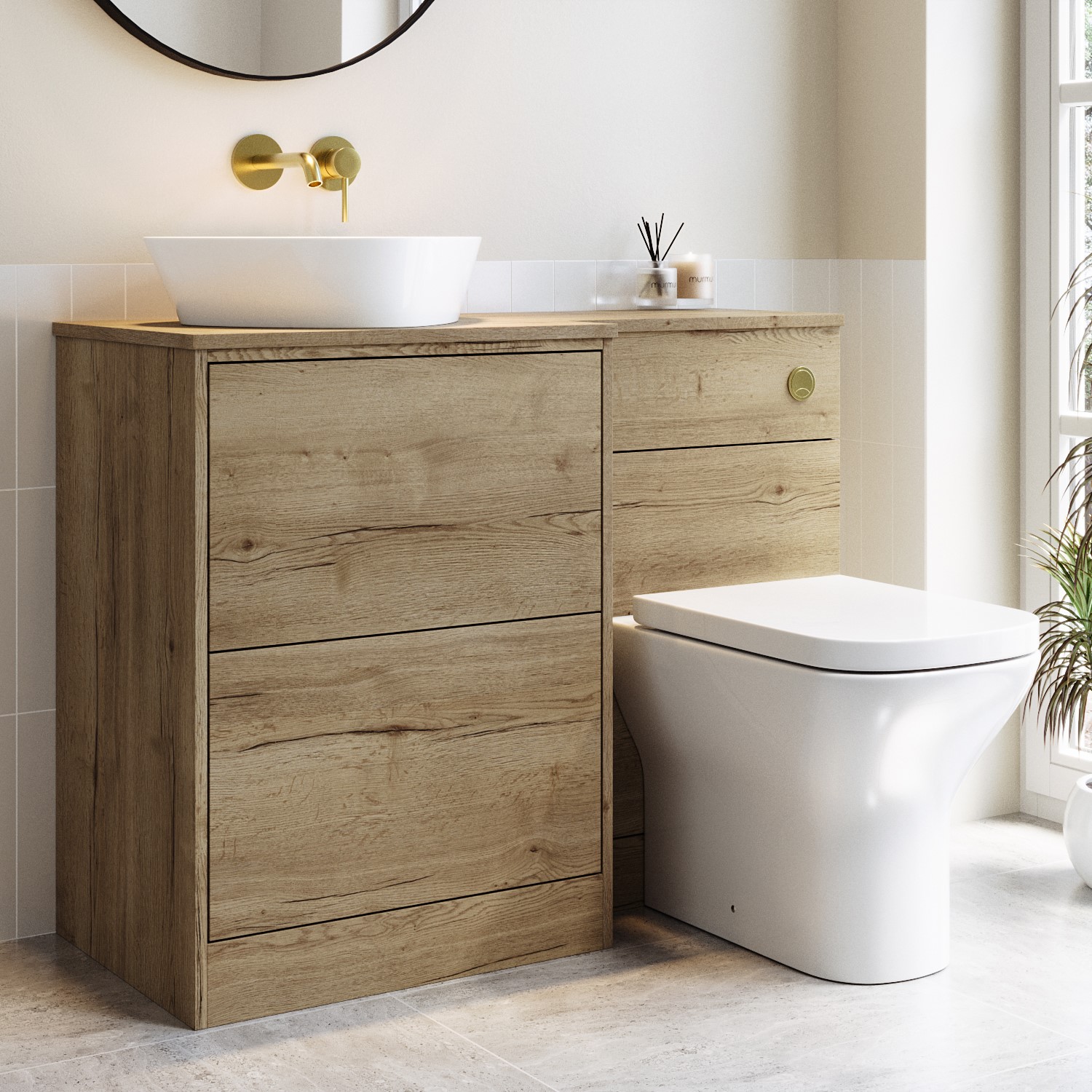 Enhance your bathroom with this left-hand modern oak toilet and sink unit with brushed brass push button, designed with the sink unit and basin conveniently positioned to the left of the toilet. The unit has 2 push to open drawers with plenty of room to store your bathroom essentials. The drawer opening distance is a generous 255mm. The unit has no pre-drilled holes for added flexibility.