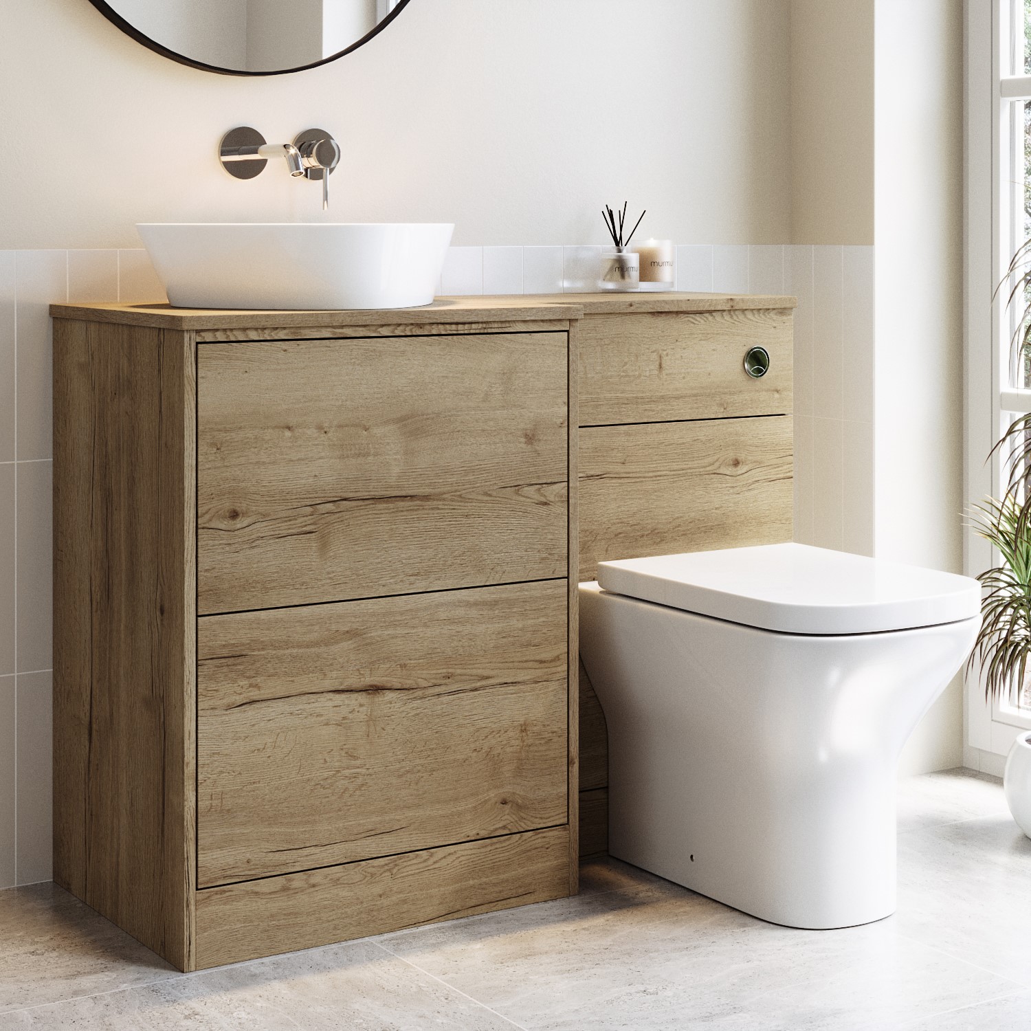 Enhance your bathroom with this left-hand modern oak toilet and sink unit with chrome push button, designed with the sink unit and basin conveniently positioned to the left of the toilet. The unit has 2 push to open drawers with plenty of room to store your bathroom essentials. The drawer opening distance is a generous 255mm. The unit has no pre-drilled holes for added flexibility.