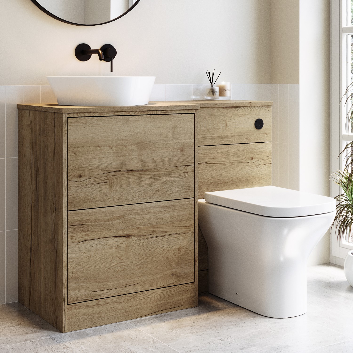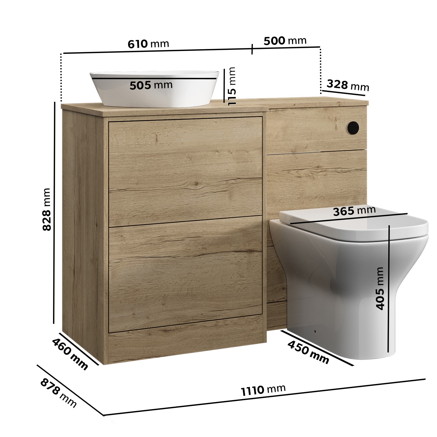 Enhance your bathroom with this left-hand modern oak toilet and sink unit with matt black push button, designed with the sink unit and basin conveniently positioned to the left of the toilet. The unit has 2 push to open drawers with plenty of room to store your bathroom essentials. The drawer opening distance is a generous 255mm. The unit has no pre-drilled holes for added flexibility.