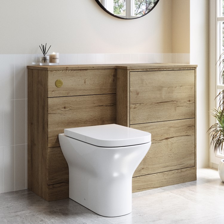 Enhance your bathroom with this right-hand modern oak toilet and sink unit with brushed brass push button, designed with the sink unit conveniently positioned to the right of the toilet. The unit has 2 push to open drawers with plenty of room to store your bathroom essentials. The drawer opening distance is a generous 255mm. The unit has no pre-drilled holes for added flexibility