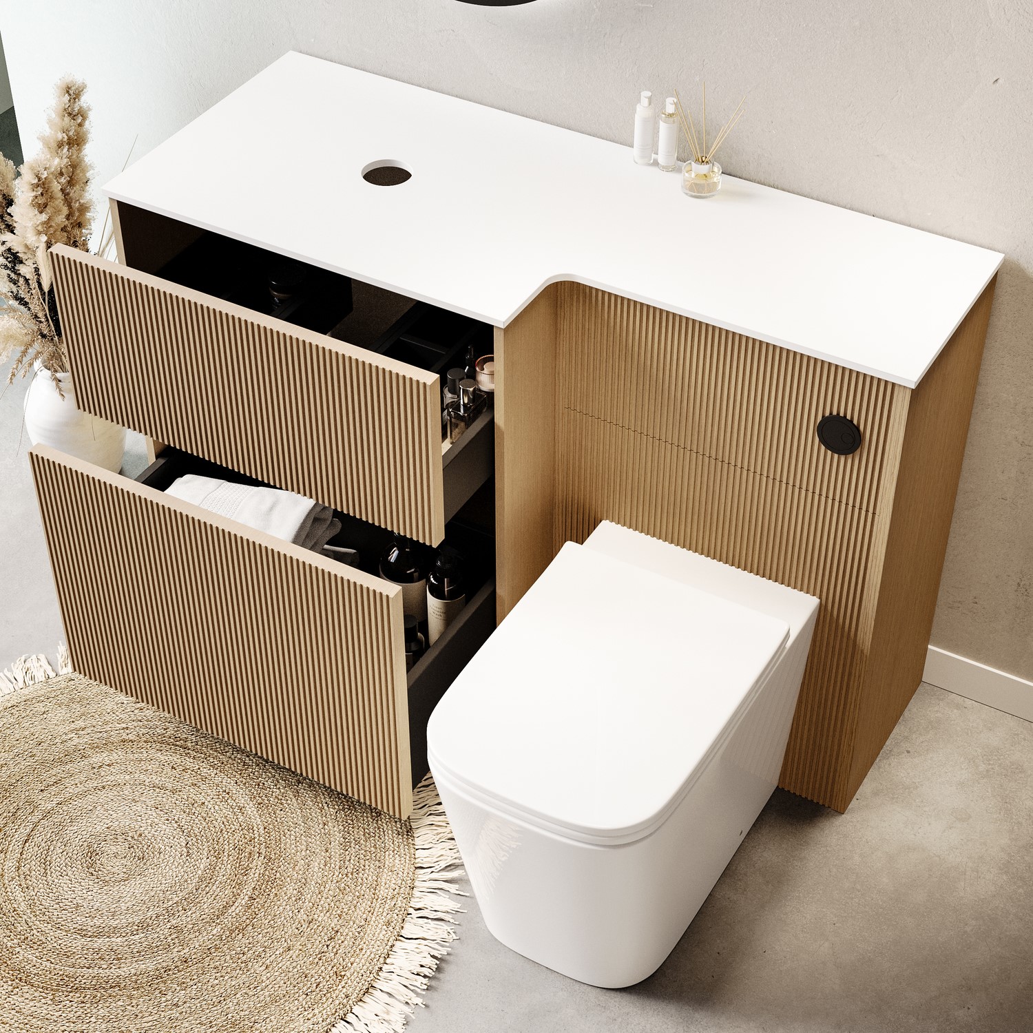 Bringing form and function together, the Matira 1150mm toilet and sink unit is the perfect upgrade for your modern bathroom. The fluted wooden detailing and natural wood veneer finish deliver natural charm, while the black push button adds a subtle luxury highlight. This left-hand layout is perfect for room configurations where the basin is needed to the left of the toilet.