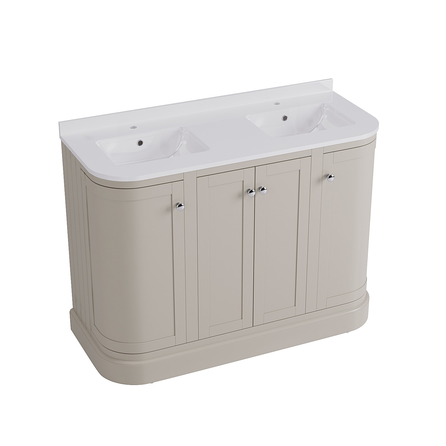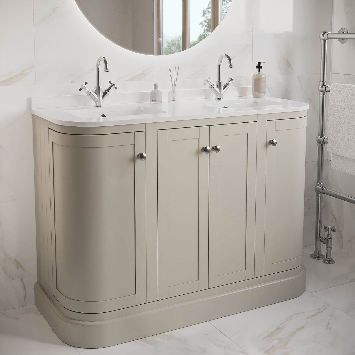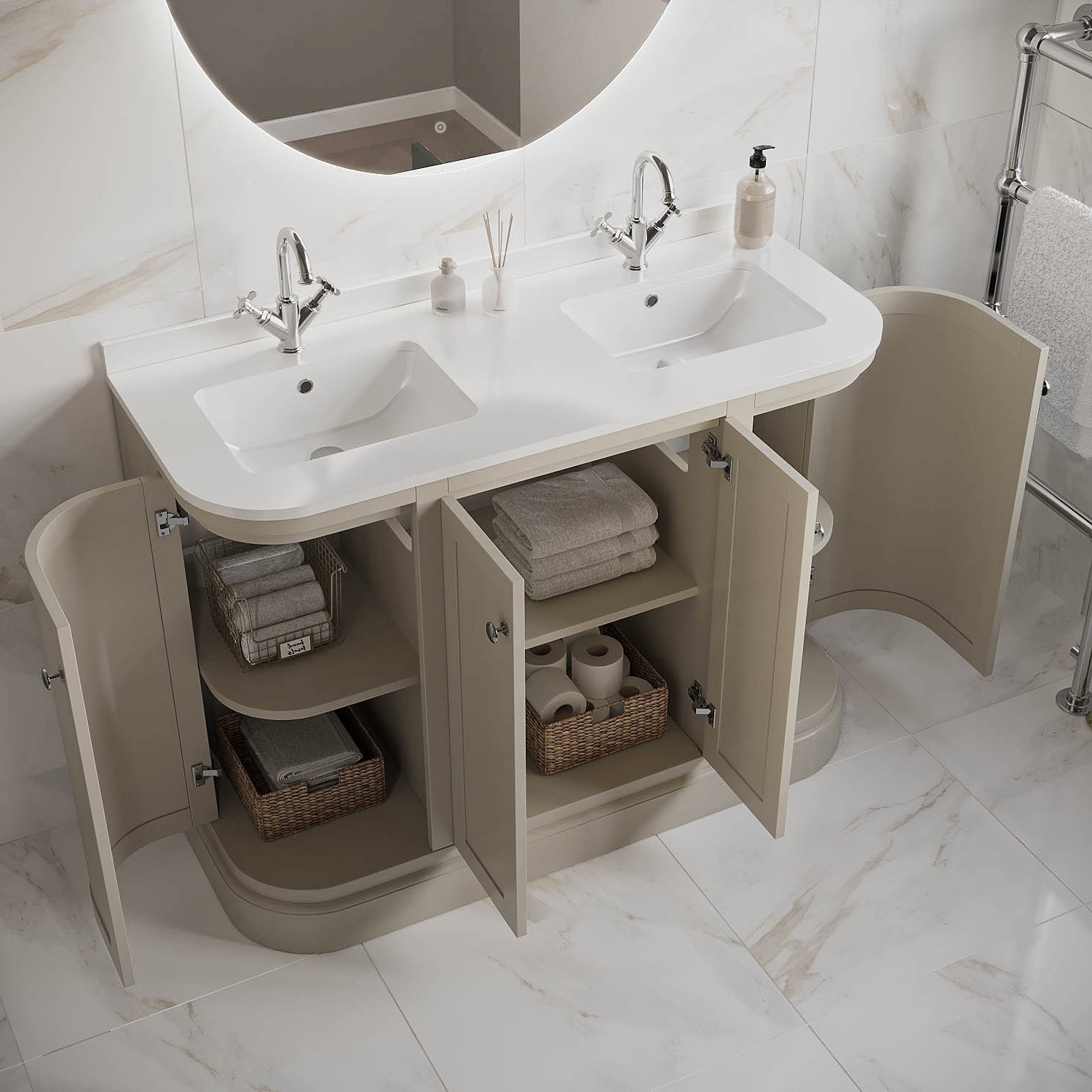 Transform your bathroom into a refined sanctuary with this large Bowland 1200mm curved Floorstanding vanity unit. Finished in a clean satin beige, this vanity is inspired by timeless traditional elegance, this beautifully contoured design combines soft curves with a flawless finish, creating a statement piece that exudes sophistication. The unit features polished chrome handles for a touch of classic luxury, paired with a sleek resin double inset basin, complete with matching chrome overflow covers and a premium quartz worktop surround—a combination that delivers durability and style in equal measure. Four soft close doors open wide to reveal six interior compartments offering generous under-sink storage, ideal for keeping everyday essentials organised and within easy reach.