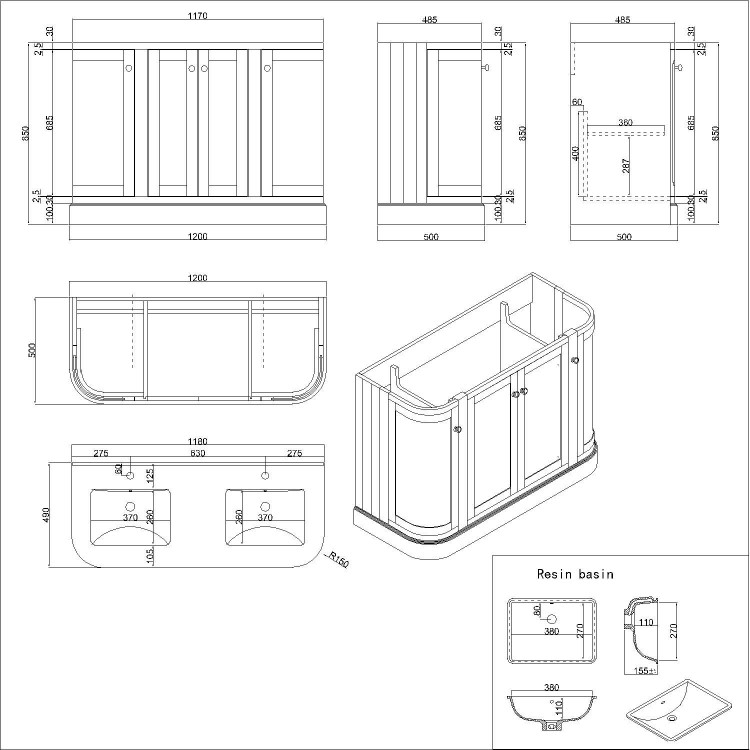 - Overall Basin Vanity Dimensions (including basin): H850mm x W1200mm x D500mm