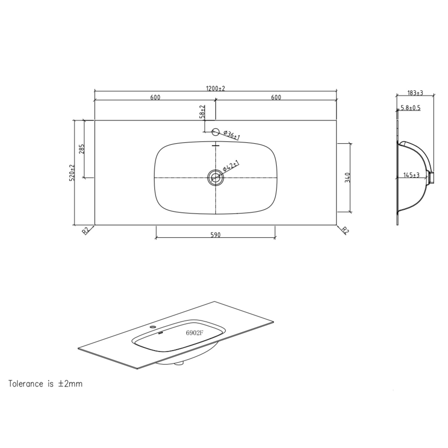 - Internal Basin Dimensions: H 145 x W 590 x D 340 mm