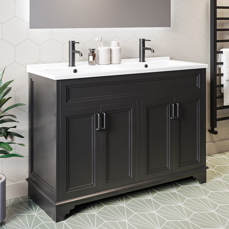 Give your bathroom a fresh, modern look with the Camden 1200mm vanity basin unit. Part of the Camden range of furniture, this unit is finished with matt black paint so it’s muted colour palette will look great in any bathroom. Manufactured to the highest standard, this unit features traditional shaker detailing throughout. The metal handles give the unit a modern edge and open to reveal interior shelves with room to store all your toiletries and other essentials. It even has soft closing hinges to prevent slamming and unnecessary damage. A high-quality ceramic inset basin is also included, with two central tap holes; a tap isn’t included, so you’re free to choose your favourite.