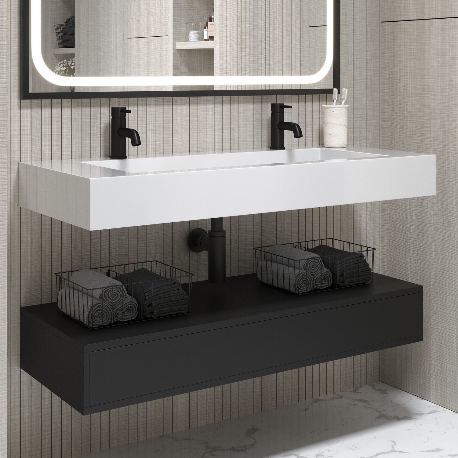 Wall-Hung Double Vanity: Creates an open, airy feel while maximizing floor space—ideal for spacious or shared bathrooms.