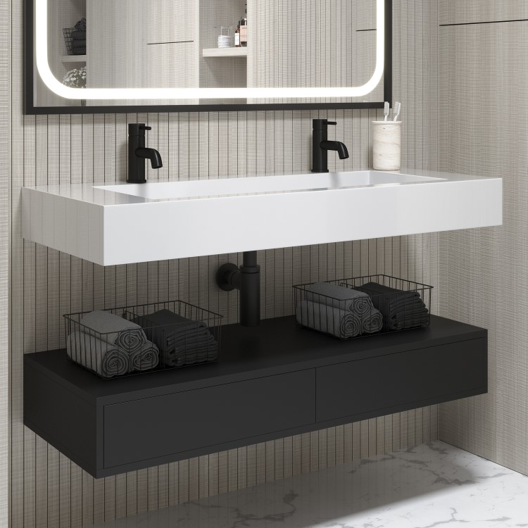 Upgrade your bathroom with the 1200mm Oslo basin and matt black floating vanity unit. This unit features a durable resin basin with a sleek, wall hung design, paired with a matte black drawer unit that offers ample storage while maintaining a minimalist aesthetic. The wall hung setup helps to open up floor space, creating the illusion of a larger, more open bathroom, perfect for modern living. The push-to-open drawers ensure effortless access to your essentials, while the gloss white basin brings brightness and warmth to your space. Ideal for compact bathrooms, or those seeking a sleek, modern aesthetic. This unit combines style, practicality, and customization options to suit your needs.
