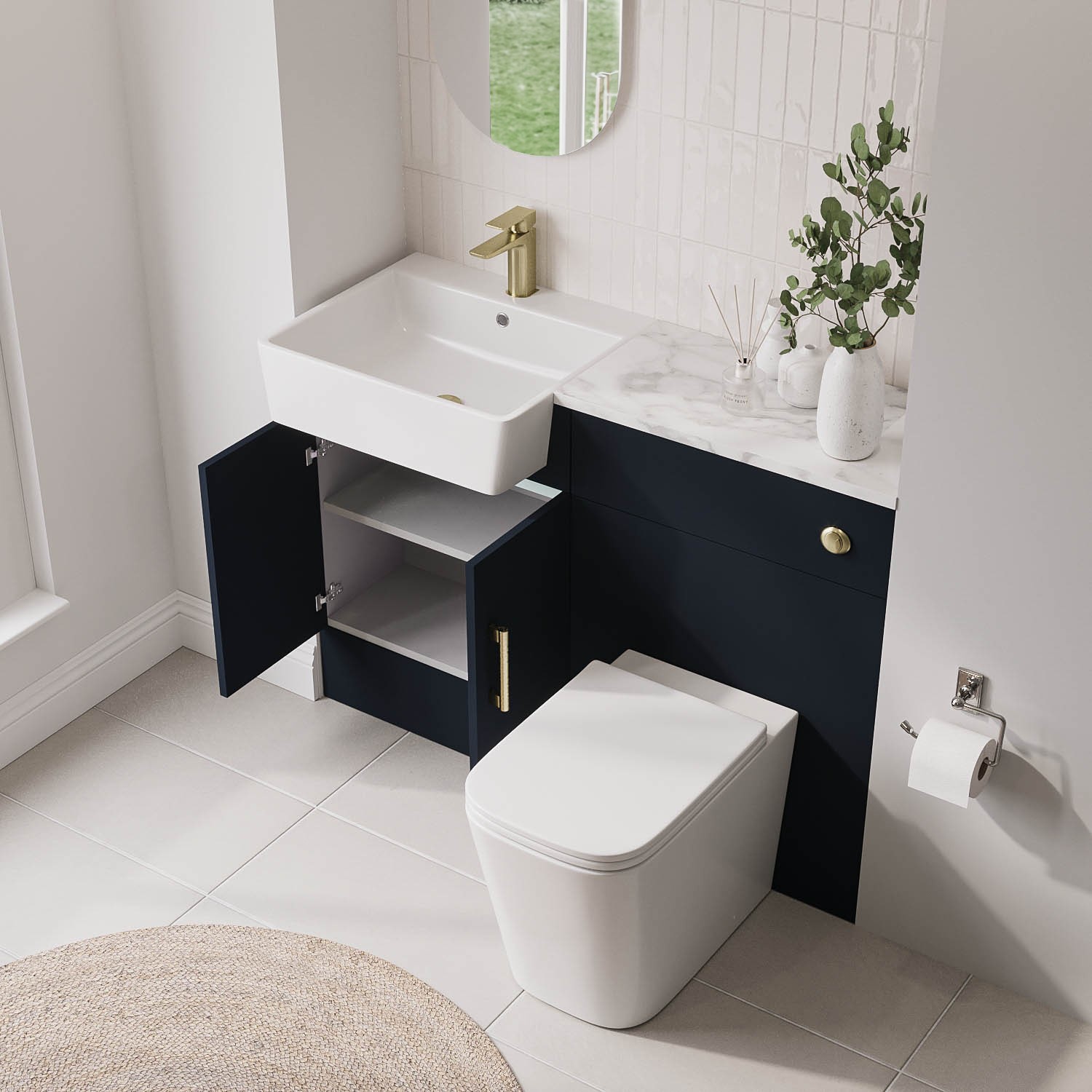 Upgrade your bathroom and set up the perfect storage solution with our Ontario fitted bathroom furniture range. Versatile as well as stylish, it will look great in any bathroom. These units feature coordinating handles and push button. It comes complete with a semi-recessed basin plus the concealed cistern, so all you need is a mixer tap and a back-to-wall toilet to finish off your desired look. The basin comes with a prefitted chrome overflow cover, but a brass one is also included in your order to change. The fully reversible modular design means you can arrange the toilet, basin, and storage units in any order to suit your bathroom layout, making it a flexible choice for different spaces. You can also customise the door opening to left or right.