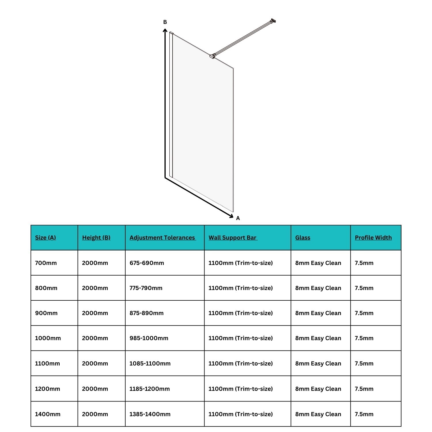 - Included fittings: Shower screen and support bar