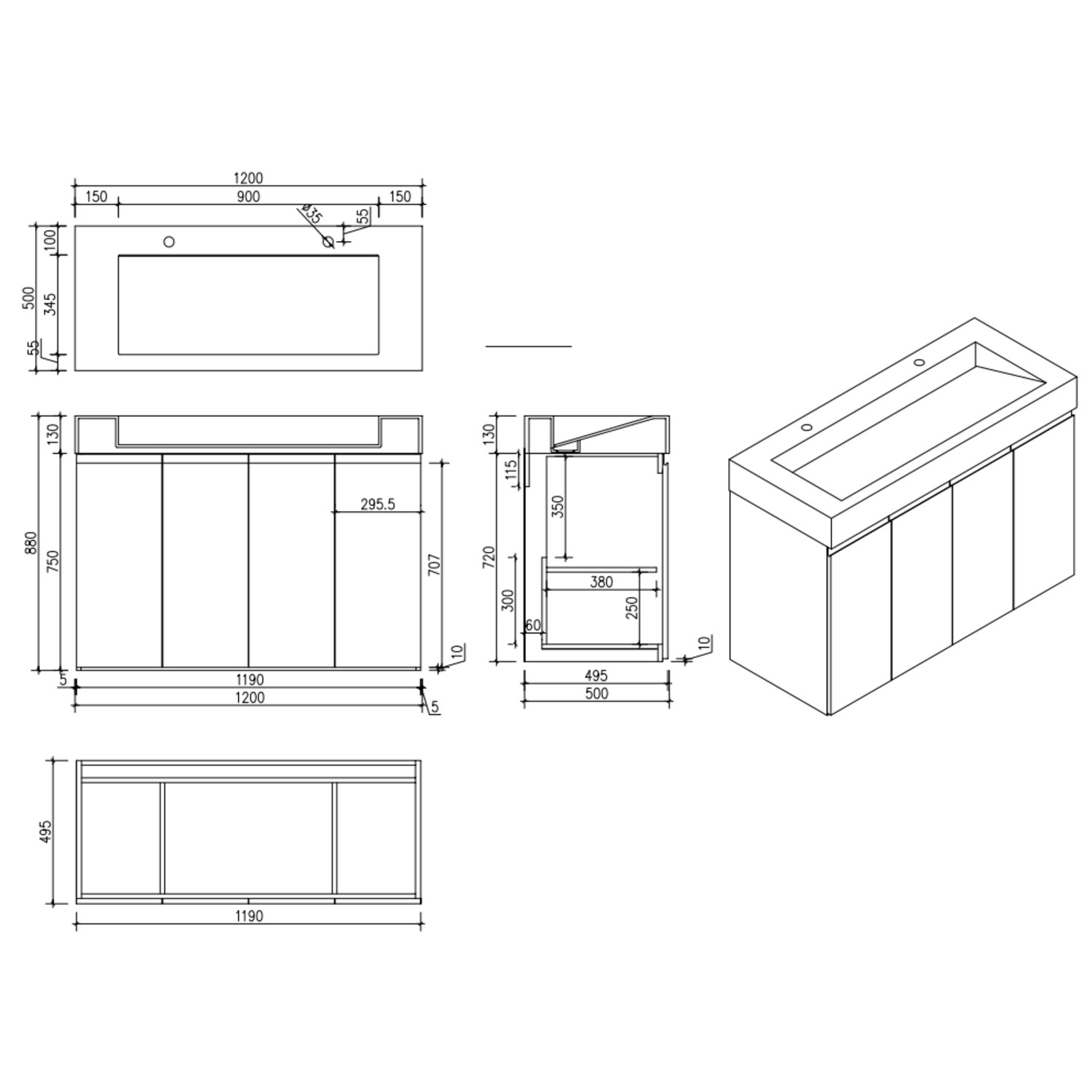 - Overall Basin Vanity Dimensions (including basin): H880 x W1200 x D500 mm