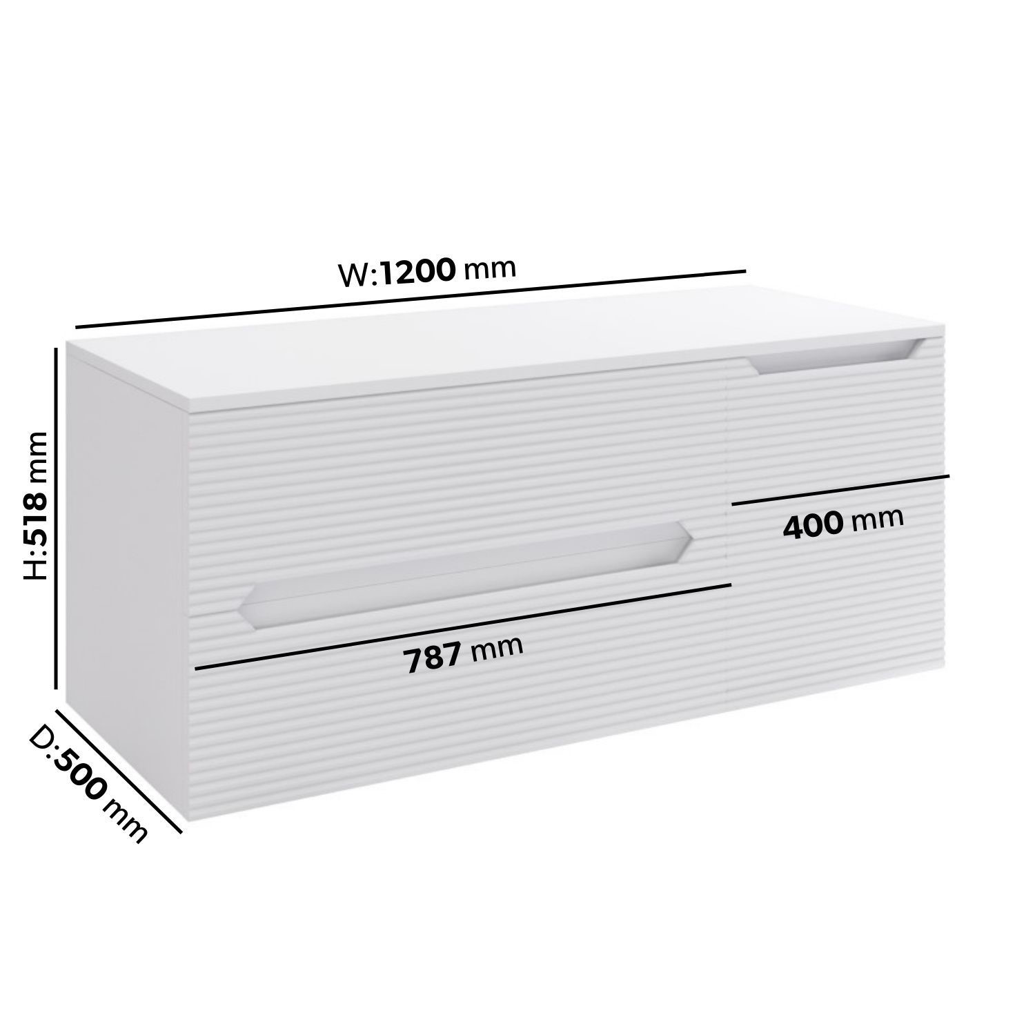 - Overall Dimensions: H518 x W1200 x D500 mm (Please note, the main footprint of this vanity unit is W1190 x D495 mm, however the overall dimensions are slightly bigger due to the worktop overhang)