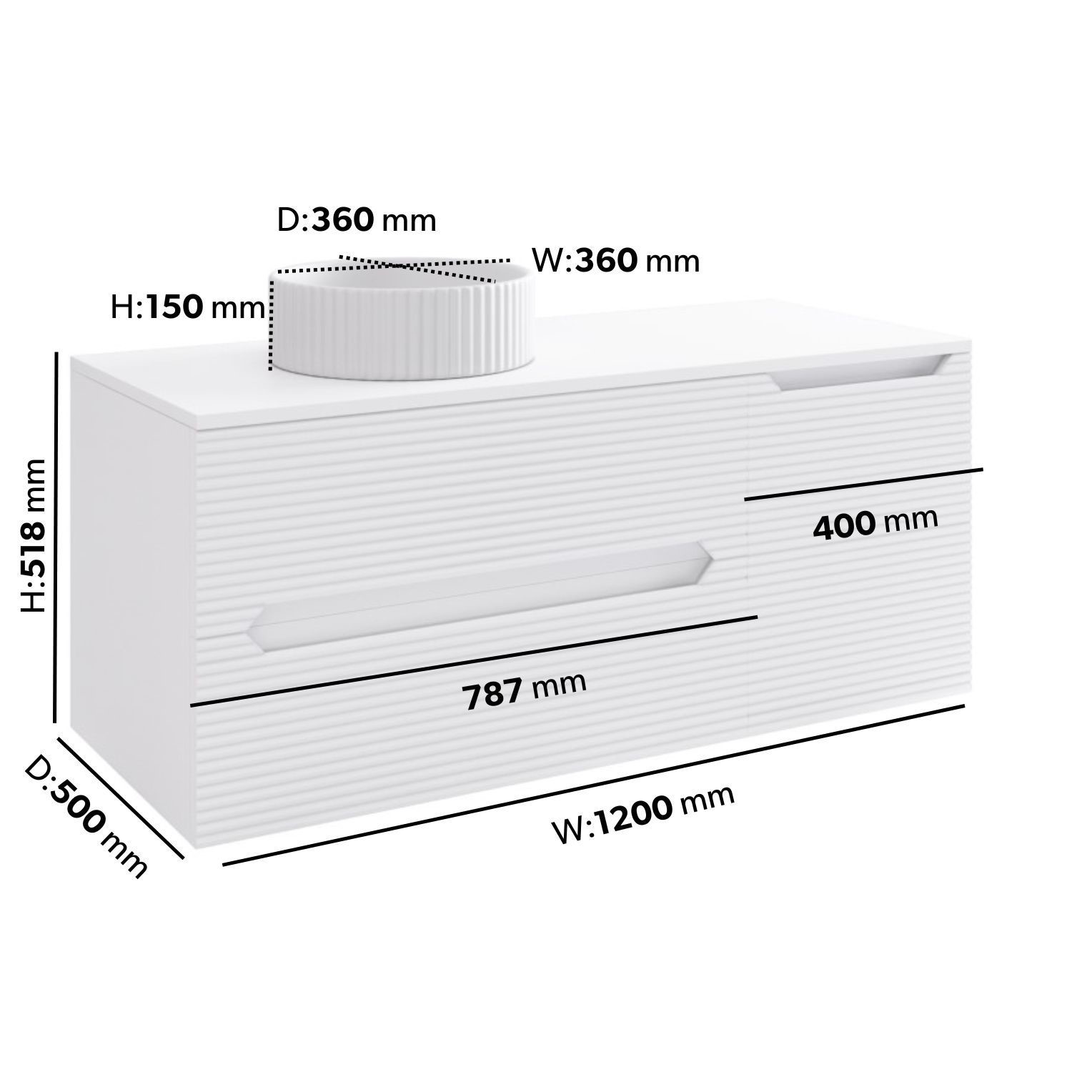 - Overall Dimensions: H518 x W1200 x D500 mm (Please note, the main footprint of this vanity unit is W1190 x D495 mm, however the overall dimensions are slightly bigger due to the worktop overhang)