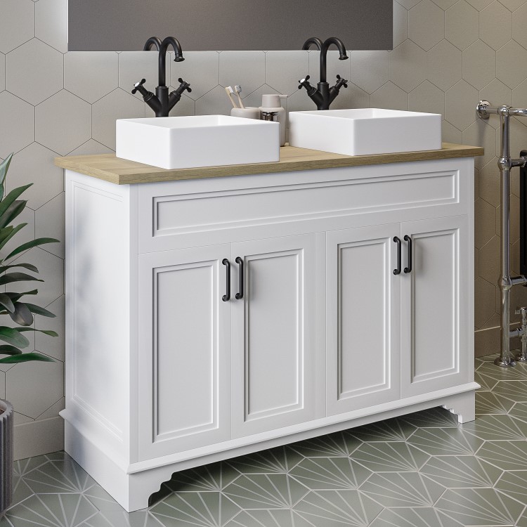 - Traditional freestanding vanity unit in a matt white finish