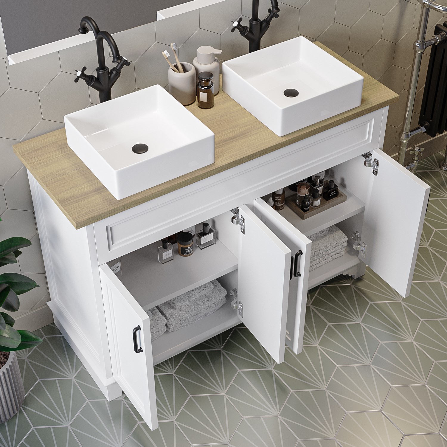 Give your bathroom a traditional makeover with the matt white Camden vanity unit. The black metal handles give the unit an industrial edge and open to reveal 2 interior shelves with room to store all your toiletries and other essentials. The unit comes with a stylish wood effect worktop and 2 white square countertop basins. The countertop basins are made from high-quality ceramic and are finished in gloss white. Remember to add your 2 tall basin mixer or wall mounted taps to complete the look. Both the unit and the worktop have a 2 years warranty for added peace of mind. The basins have a 5 years guarantee for your assurance.