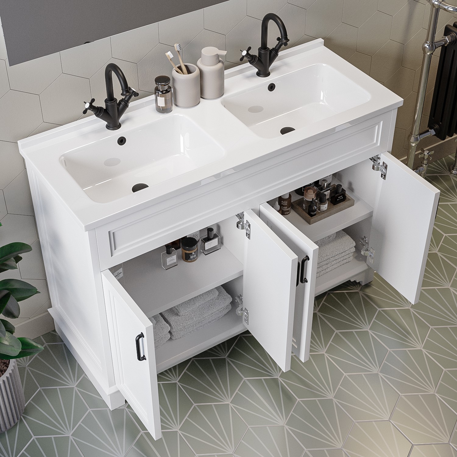 Give your bathroom a traditional makeover with the matt white Camden vanity unit. The black metal handles give the unit an industrial edge and open to reveal 2 interior shelves with room to store all your toiletries and other essentials. A high-quality ceramic inset basin is also included, with two central tap holes; a tap isn't included, so you're free to choose your favourite. The vanity unit has a 2 years warranty for added peace of mind.