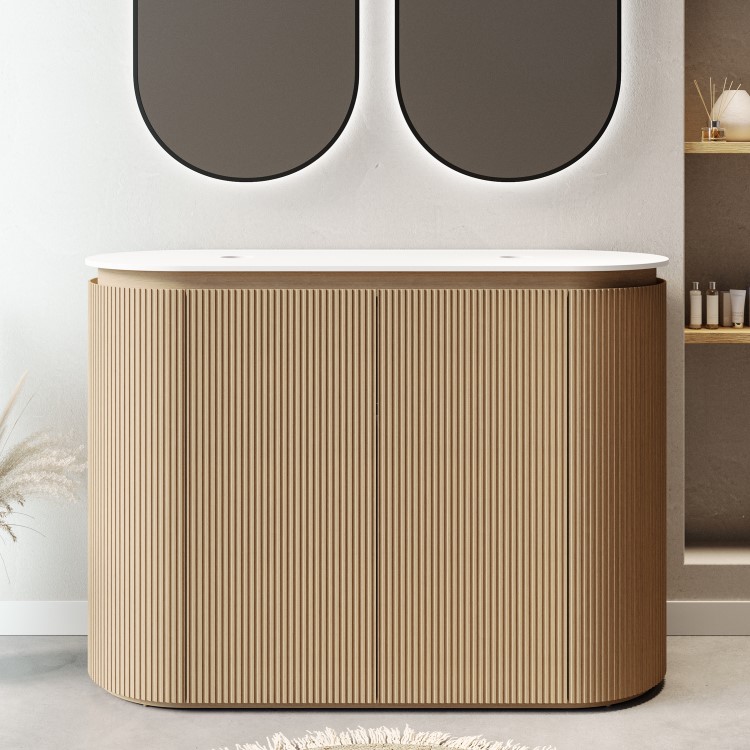 Curved Fluted Double Vanity Design: Freestanding double basin vanity unit with a modern curved light wood veneer fluted finish, adding texture and softness to any contemporary bathroom.