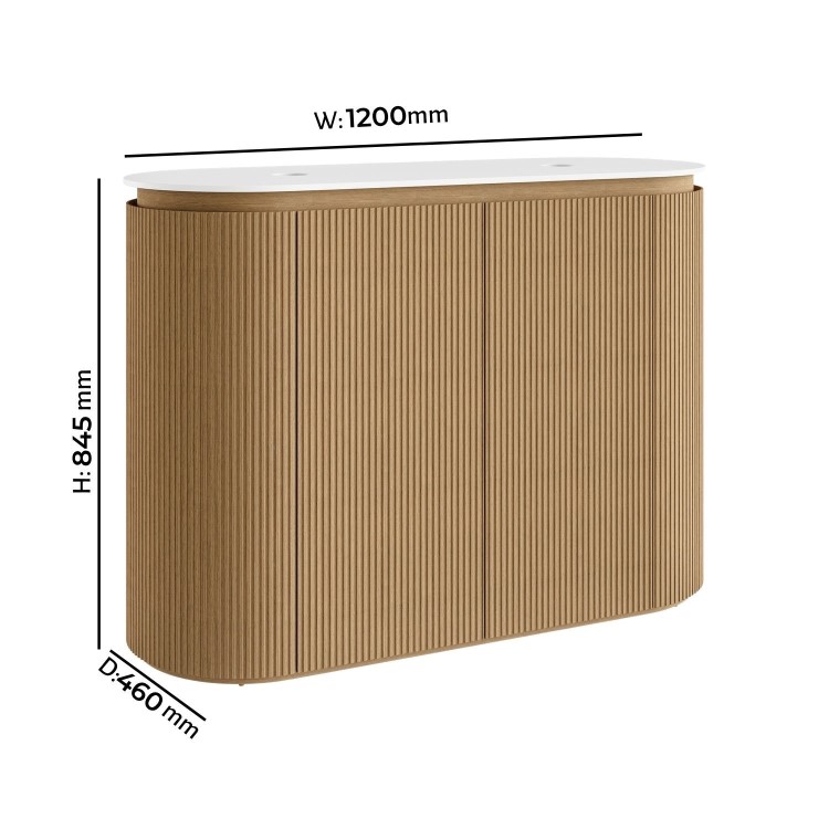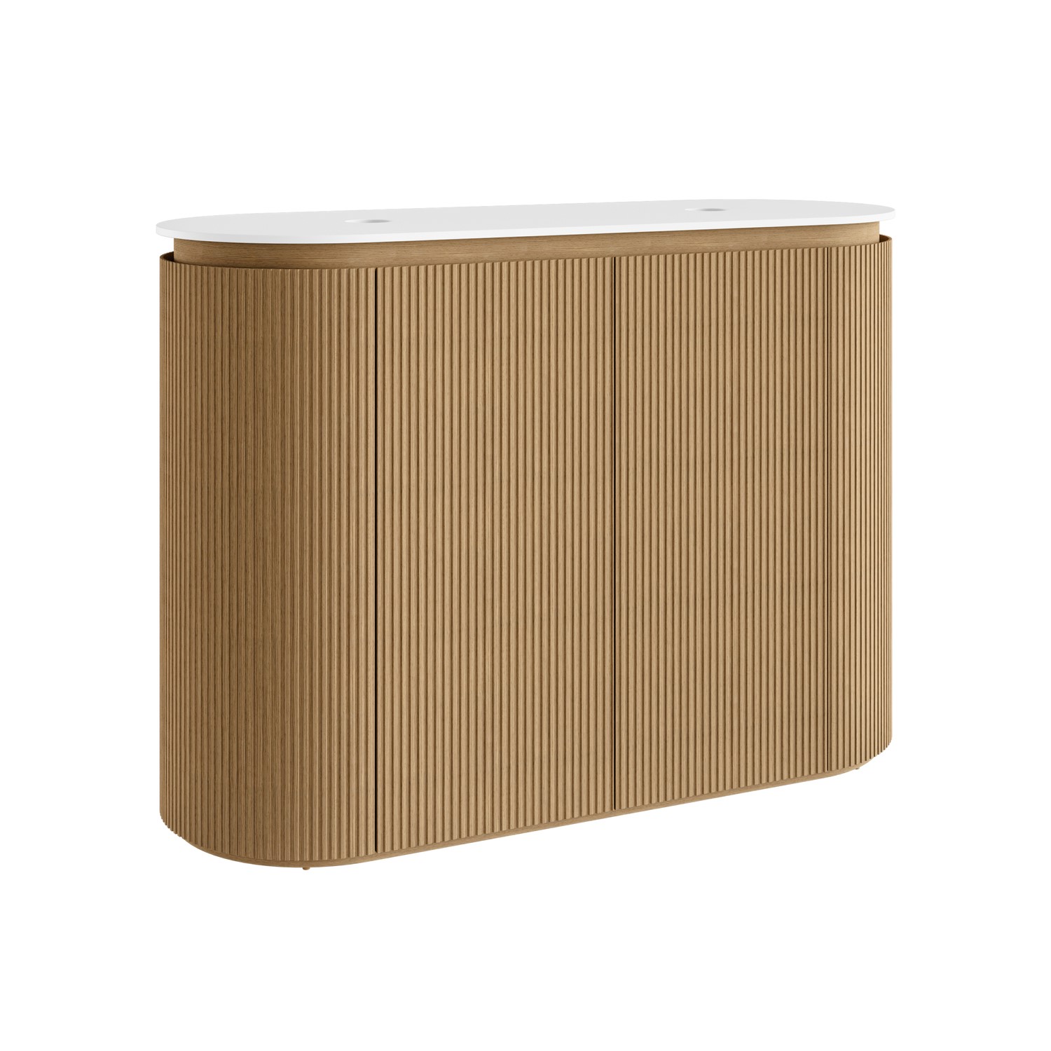 Upgrade your bathroom with the 1200mm oak Matira curved fluted freestanding double vanity unit, designed to bring contemporary luxe style into your home. The elegant wood veneer in a light oak-effect finish adds texture and warmth, making it a perfect match for minimalist or Japandi-style interiors. The double soft-close doors feature sleek concealed handles, preserving the clean-lined look while ensuring a quiet, controlled close every time—minimising noise and preventing wear and tear over time. Inside, a single shelf creates two practical storage compartments, helping you keep your bathroom essentials neatly organised.