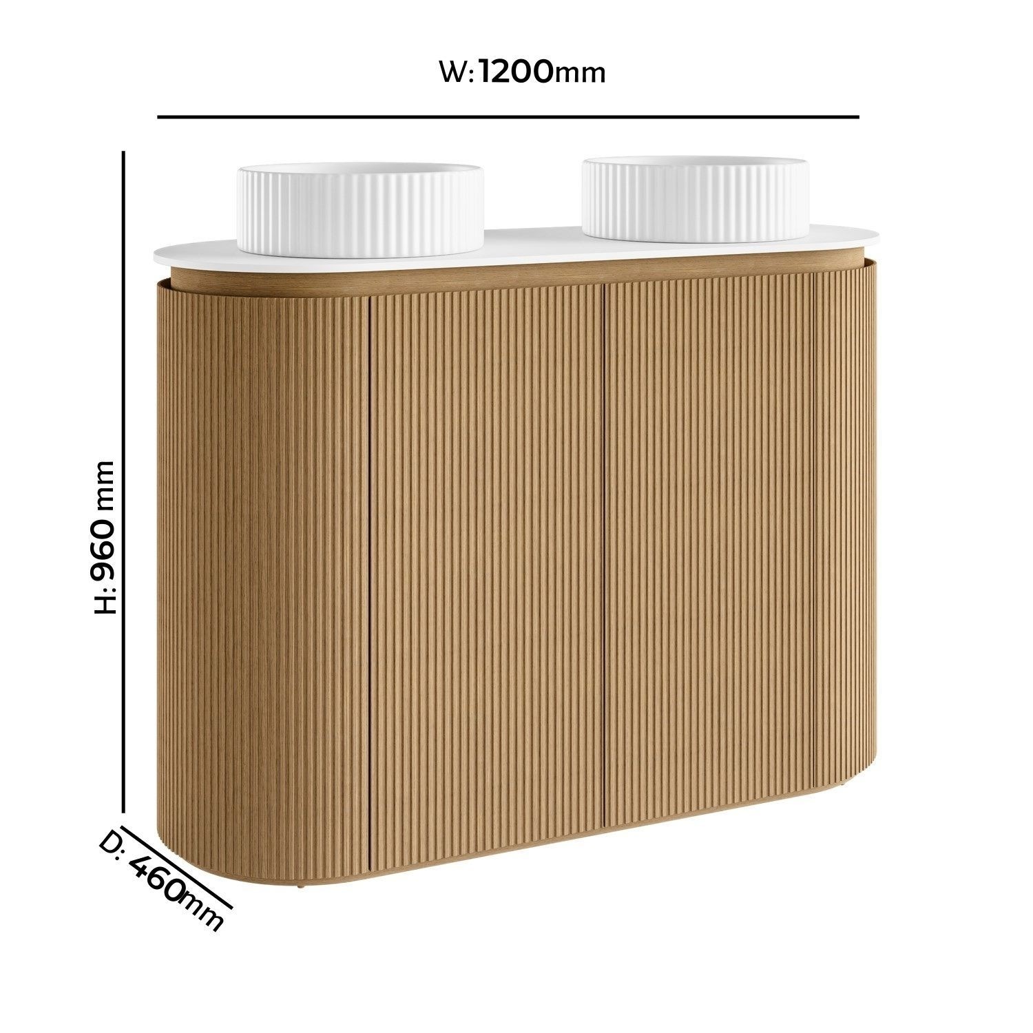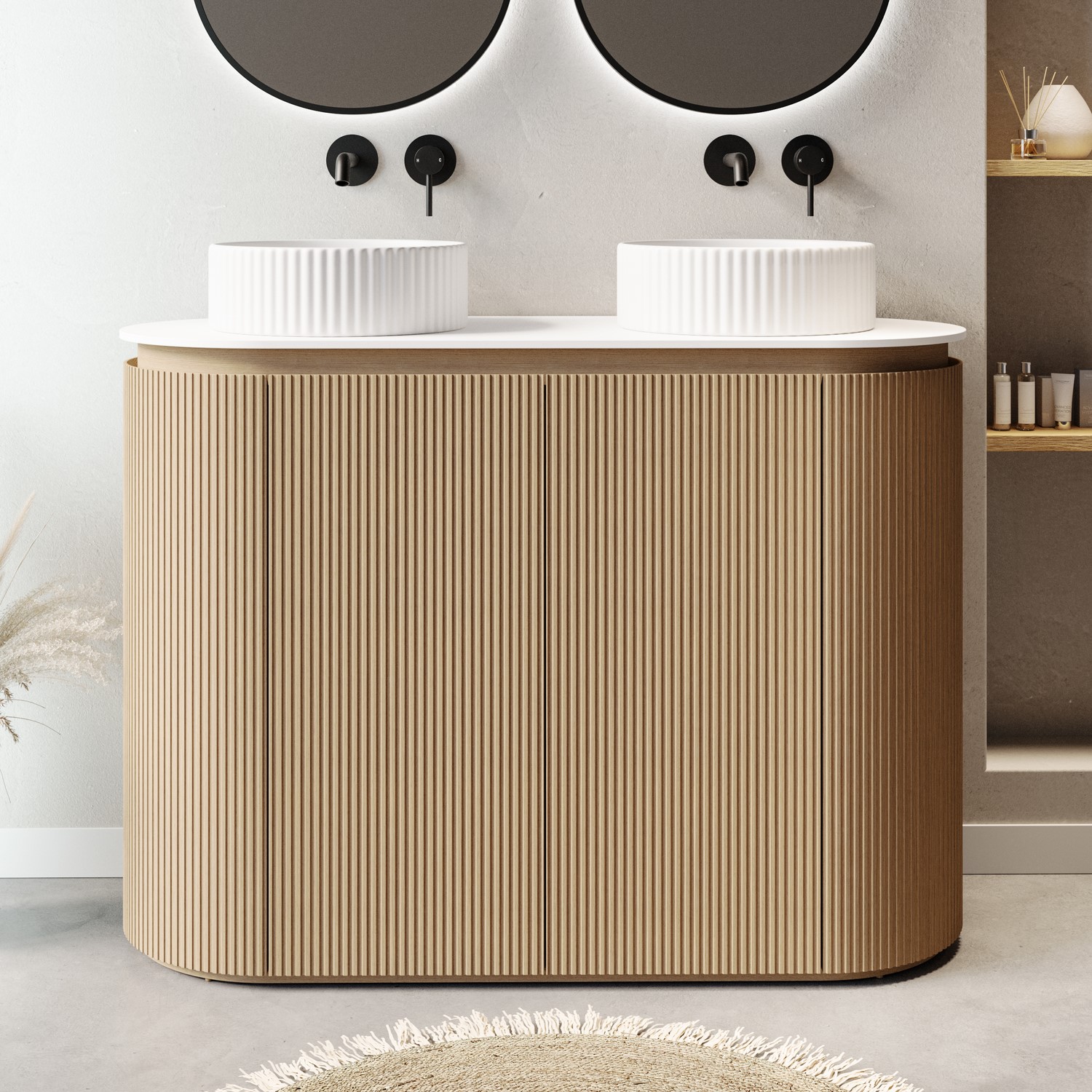 Curved Fluted Double Vanity Design: Freestanding double basin vanity unit with a modern curved light wood veneer fluted finish, adding texture and softness to any contemporary bathroom.