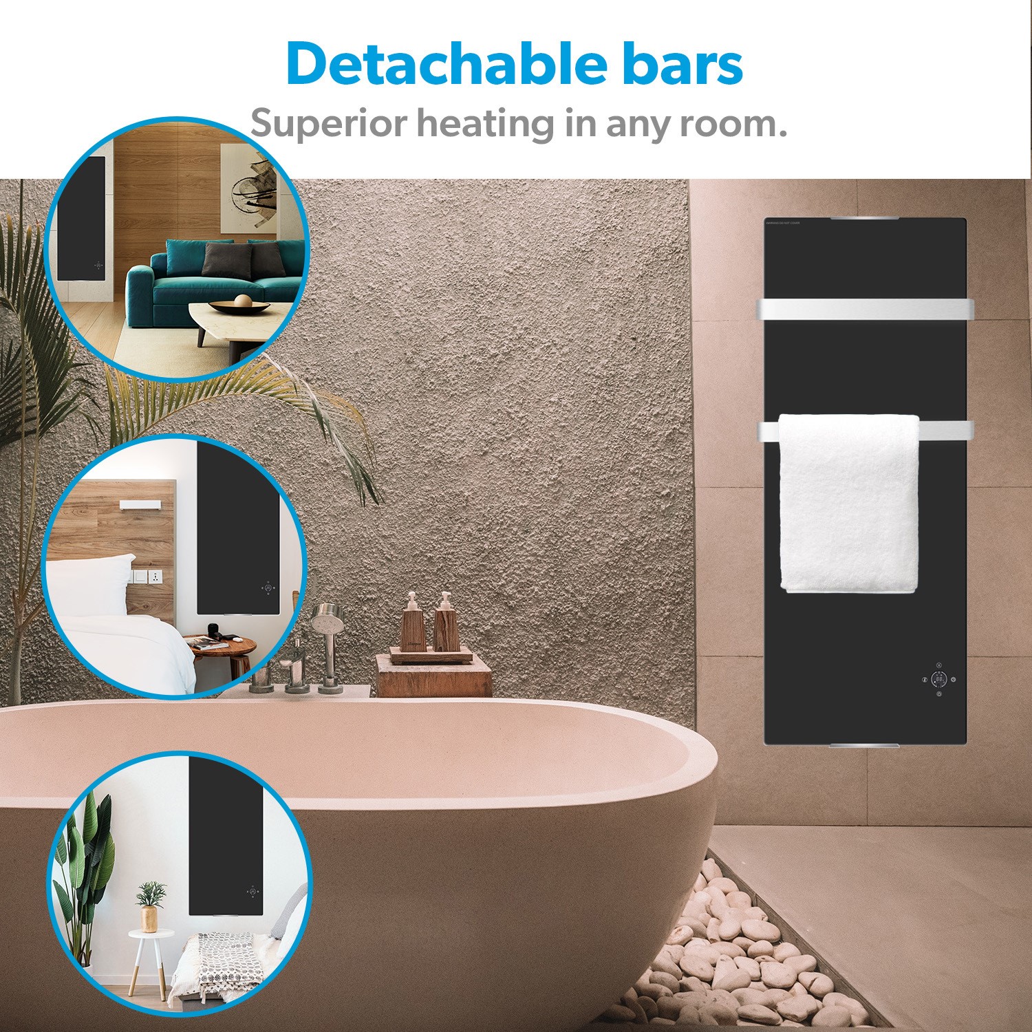 It has over-heat protection and child-lock function, very safe for household use if you have your babies around. The glass is tempered with waterproof protection of IP24 rating, a must have item for your bathroom use. Once removing the 2 rails, the radiator becomes an ultrathin design that can fit to any room and bring you such a luxurious lifestyle feeling.