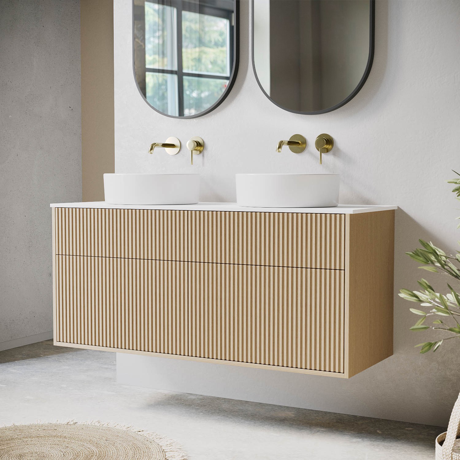 Upgrade your bathroom with our light wood fluted Matira 1250mm wall hung double vanity unit bringing a contemporary luxe style to your home. The floating vanity unit offers a space saving solution, opening up your floor space, whilst providing ample storage. The four deep fluted drawers with push to open and soft closing mechanisms add a premium touch to your bathroom.