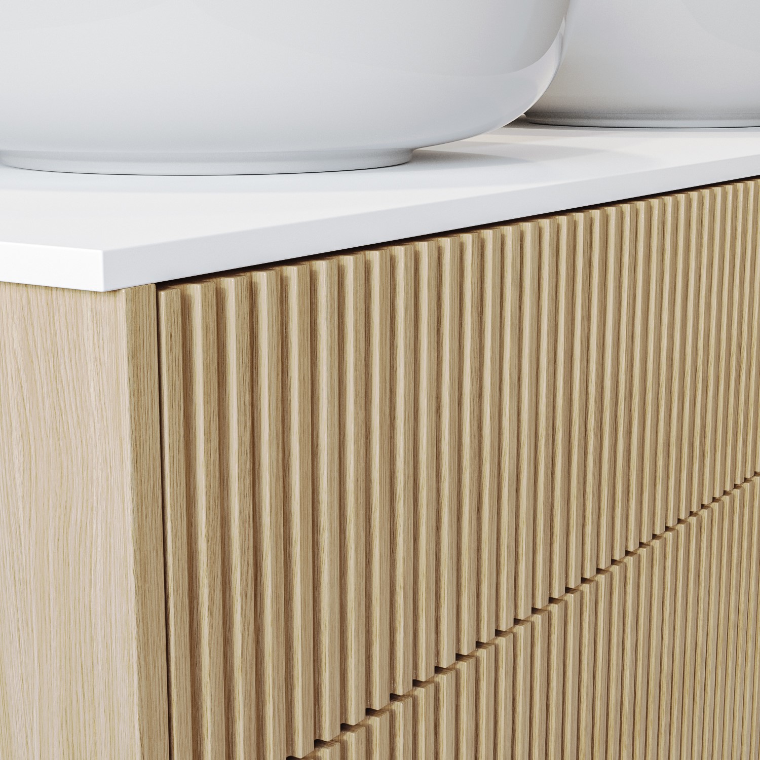 Contemporary Fluted Design: Elevate your bathroom with this contemporary wall-mounted double basin vanity featuring a natural oak fluted design and minimalist aesthetic.