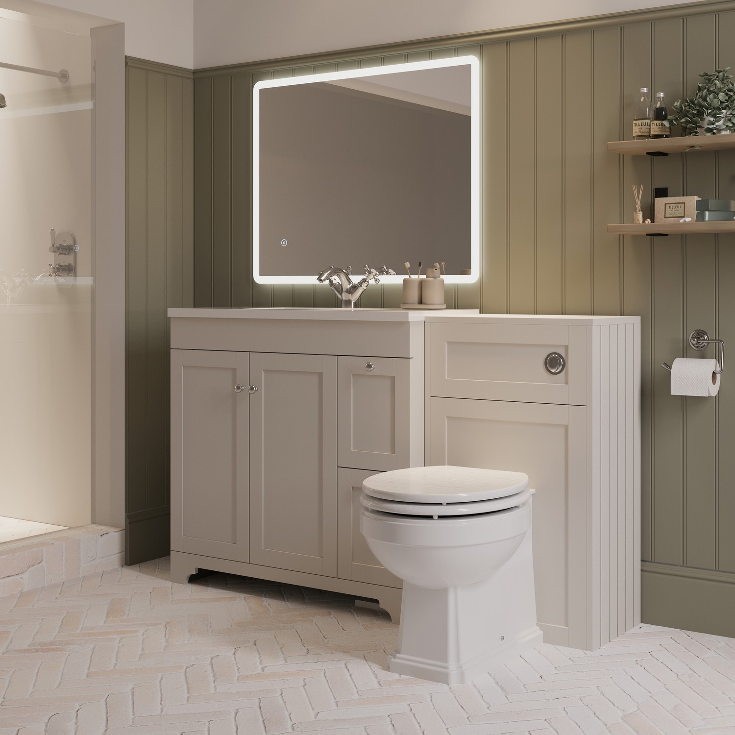 Enhance your bathroom with this charming Baxenden 1400mm toilet and sink unit, finished in a classic matt beige. The traditional styling features classic tongue-and-groove side panelling, shaker doors and ornate front skirting details to add a feature piece to your bathroom. This toilet and sink unit provides ample storage with a shelved cupboard behind the soft close doors, alongside two additional side drawers for smaller toiletries, and is reversible meaning you can chose which side the toilet unit and pan sit to suit your bathroom layout. The vanity unit and toilet unit can also be separated if you wish and positioned apart from one another.