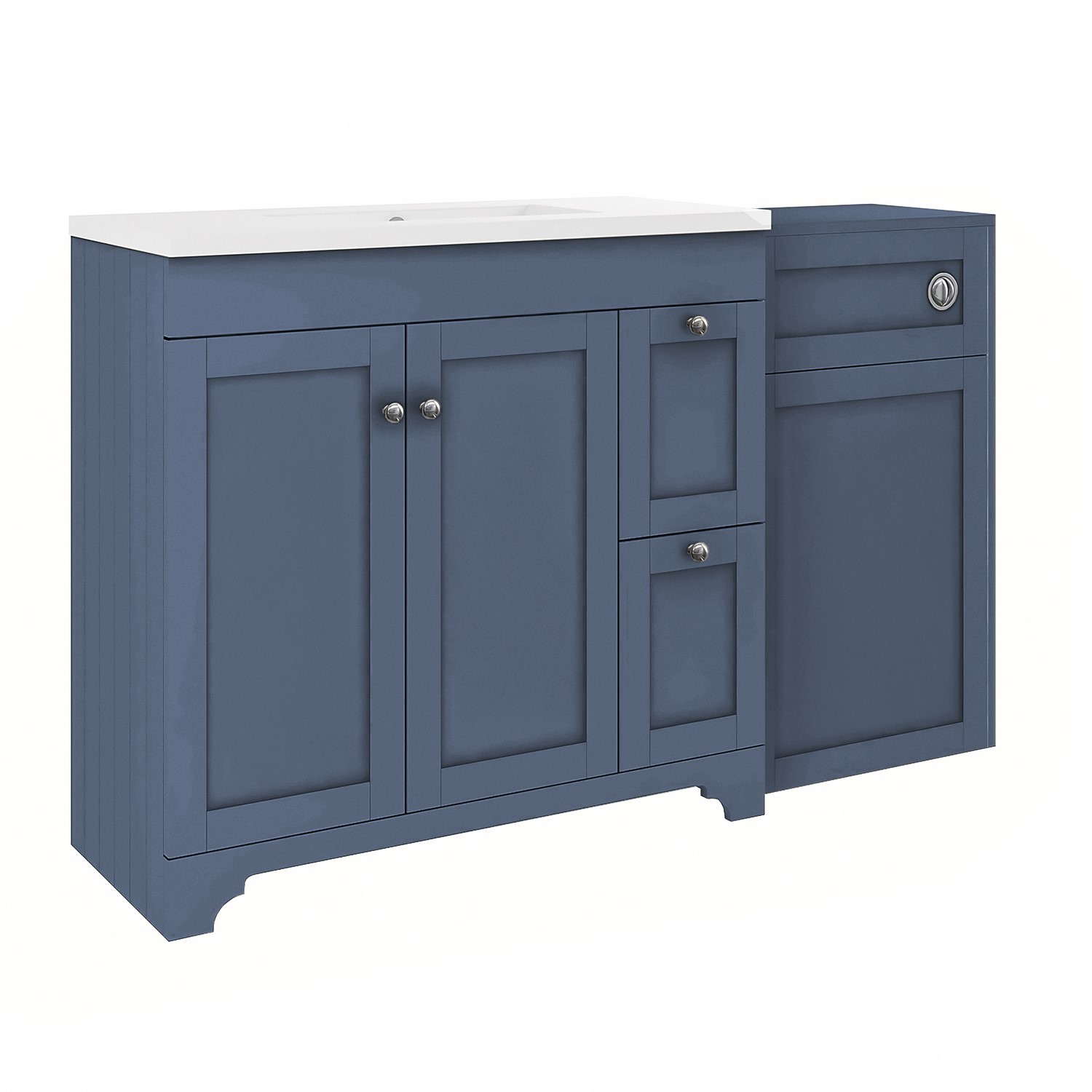 Enhance your bathroom with this charming Baxenden 1400mm toilet and sink unit, finished in a stylish matt blue. The traditional styling features classic tongue-and-groove side panelling, shaker doors and ornate front skirting details to add a feature piece to your bathroom. This toilet and sink unit provides ample storage with a shelved cupboard behind the soft close doors, alongside two additional side drawers for smaller toiletries, and is reversible meaning you can chose which side the toilet unit and pan sit to suit your bathroom layout. The vanity unit and toilet unit can also be separated if you wish and positioned apart from one another.