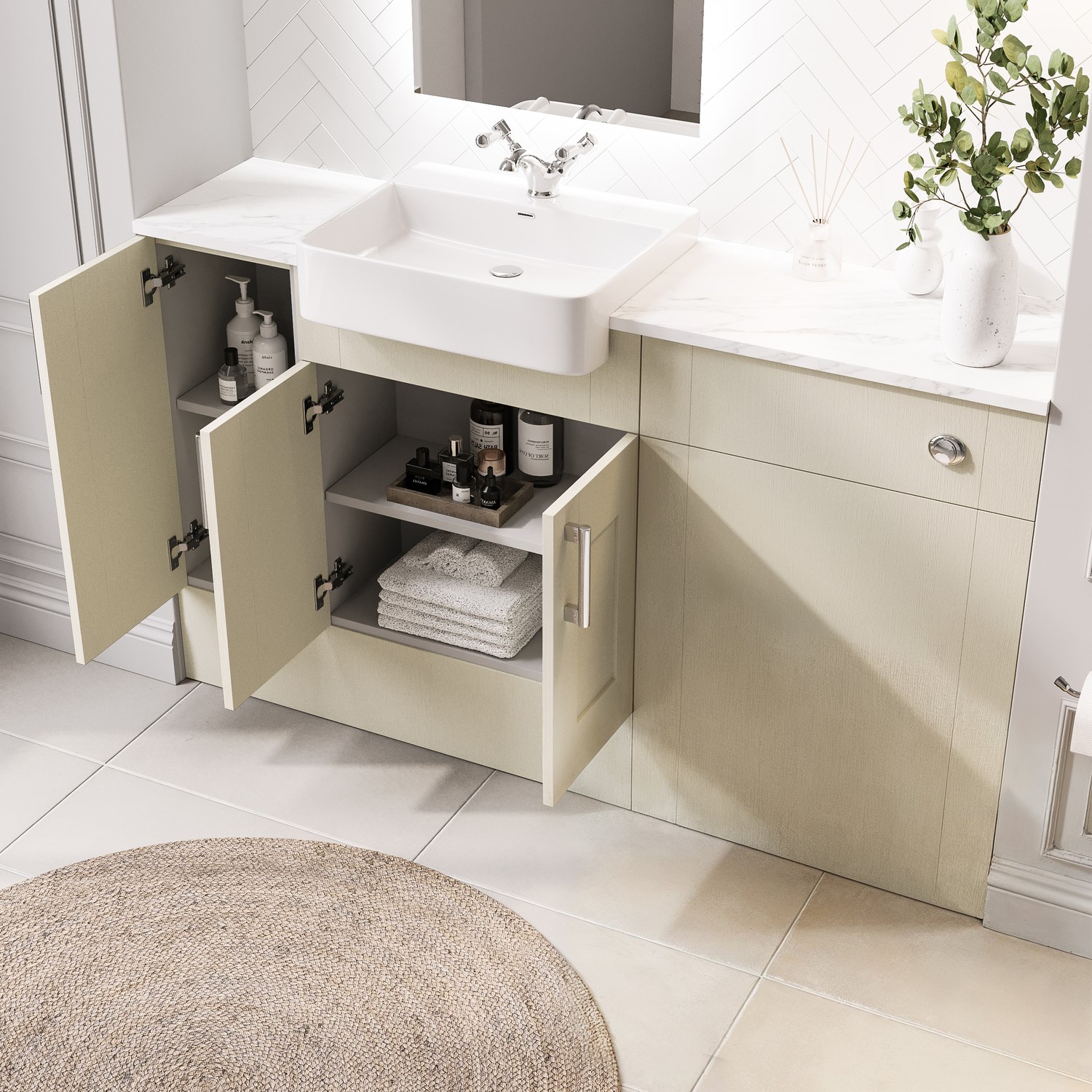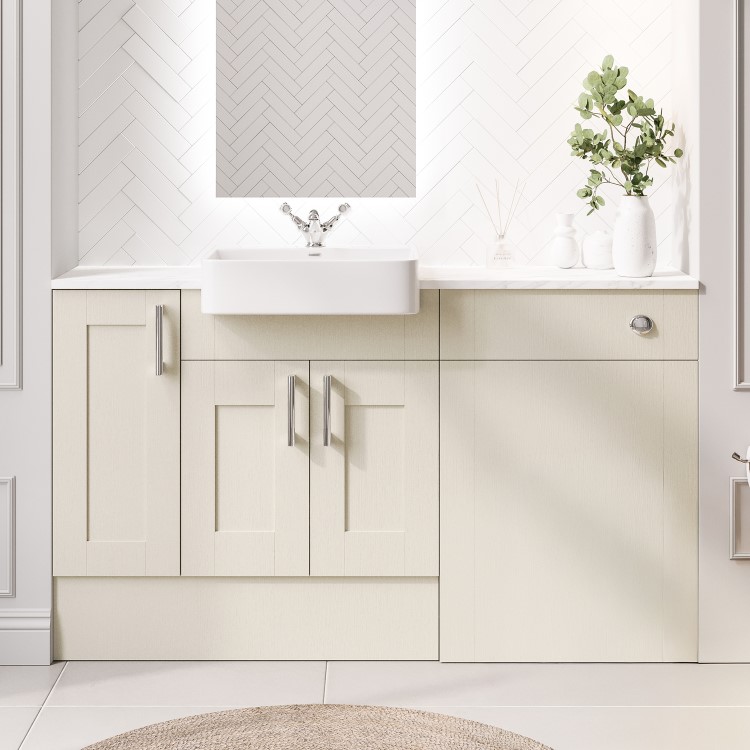 This Vancouver toilet and sink unit brings traditional charm to fitted bathroom furniture. The 1500mm width comprises a 600mm vanity unit, a 600mm toilet unit, and a 300mm storage unit - all finished in a warm beige tone with a matt wood grain effect. Shaker-style soft close doors with elegant detailing give this piece its classic character, whilst the shelved compartment within the vanity, and the additional storage unit keep your bathroom essentials neatly organised.