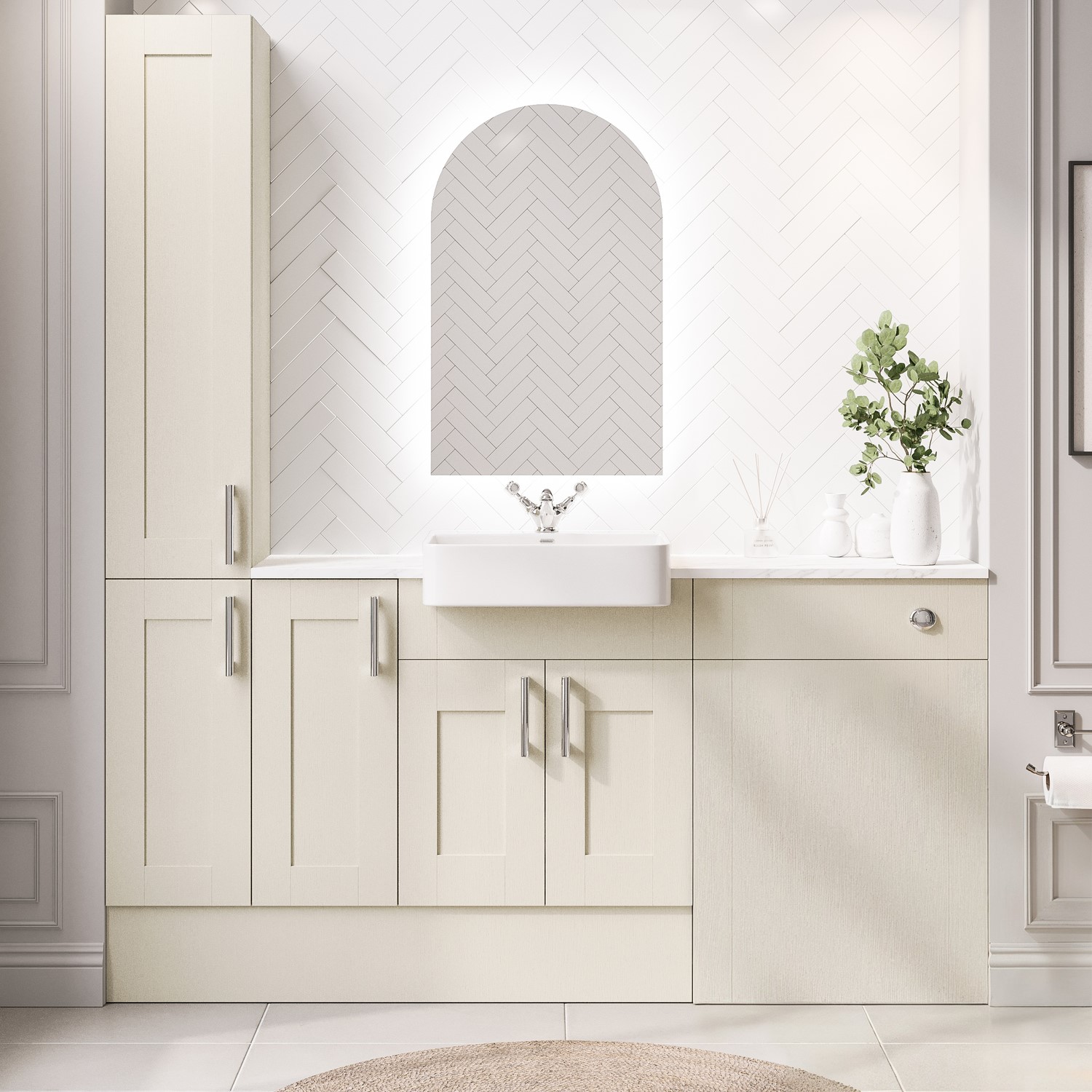 This Vancouver toilet and sink unit brings traditional charm to fitted bathroom furniture. The 1800mm width comprises a 600mm vanity unit, a 600mm toilet unit, a 300mm short storage unit as well as a 300mm tall storage unit - all finished in a warm beige tone with a matt wood grain effect. Shaker-style soft close doors with elegant detailing give this piece its classic character, whilst offering ample storage to keep your bathroom essentials neatly organised within the vanity unit, short storage unit and tall storage unit.