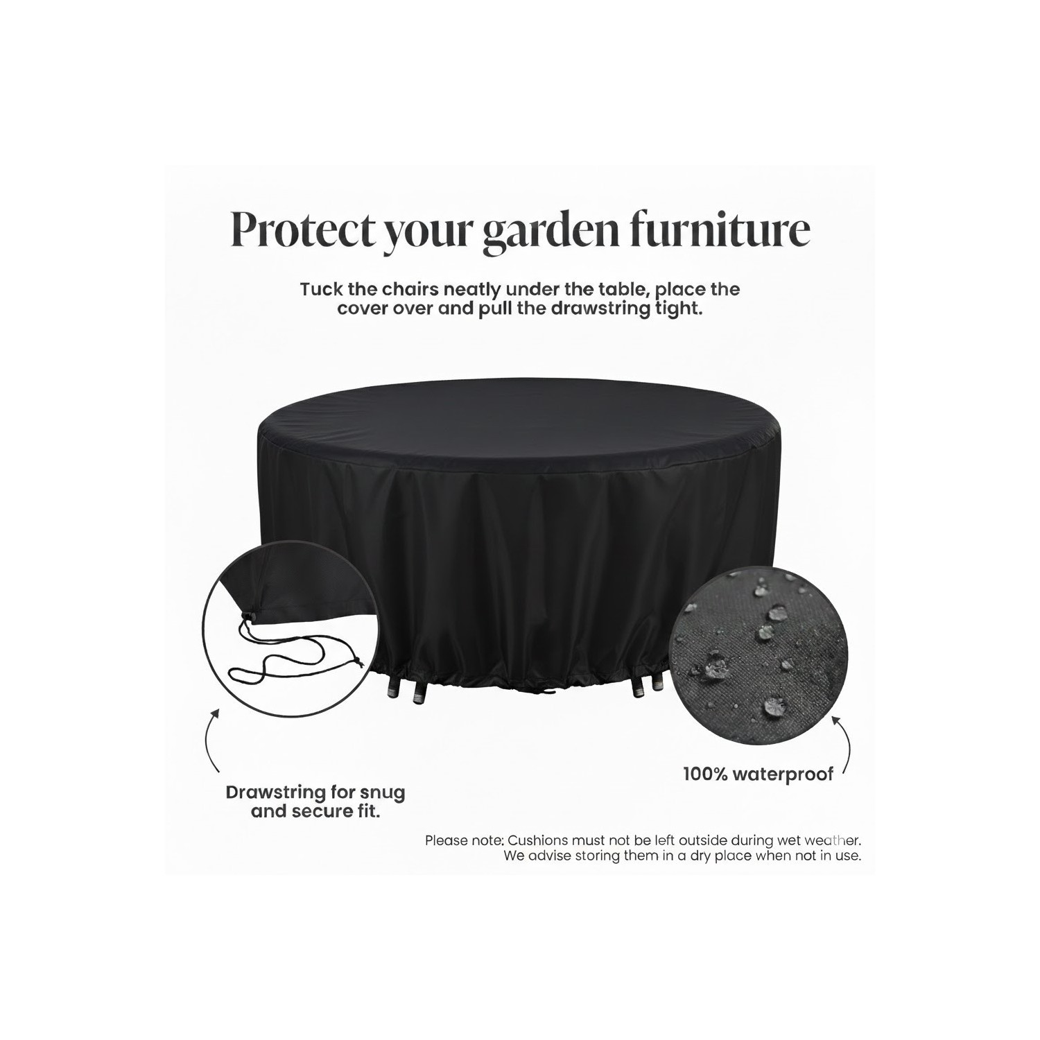 Durable Protection for Round Dining Sets: High-quality round furniture cover designed to shield your dining set from dirt and moisture.