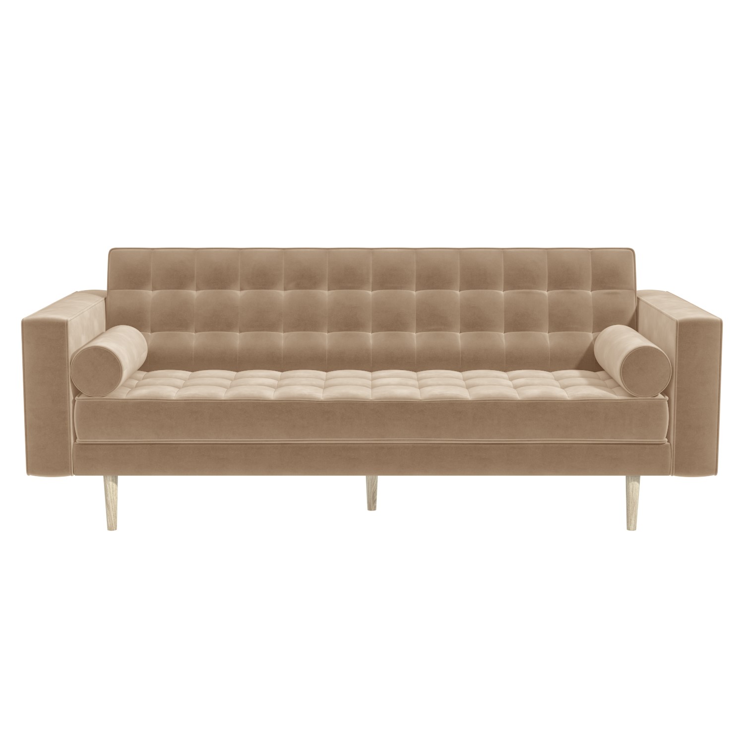 The Elba 3 seater sofa is a beautiful combination of classic and contemporary styling. Discover maximum comfort and minimum maintenance with this gorgeous, foam-filled sofa. The clean, square lines are inspired by the mid-century, whilst the double piping and buttoned back add just the right amount of opulence. The clean arms and tall tapered legs in a contrasting whitewash wood keeps the design fresh. It's finished beautifully in a sophisticated beige velvet.