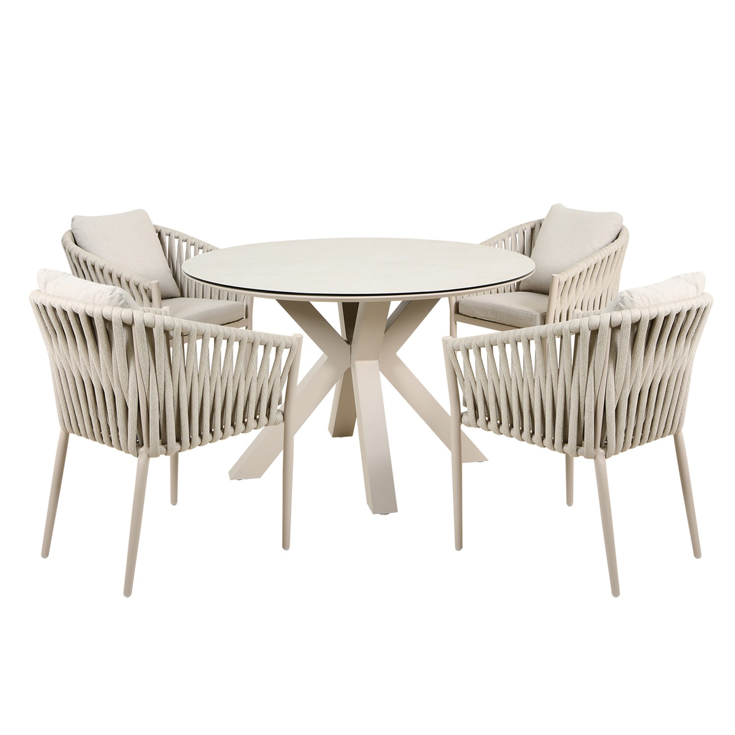 Transform your garden or patio into a refined outdoor dining space with this contemporary 4-seater set. Designed with both style and comfort in mind, it features a sleek round table paired with four beautifully crafted rope-weave chairs, creating a cohesive and inviting setting for outdoor living. The soft neutral tones and textured finishes bring a calm, modern aesthetic that complements a wide range of spaces, from minimalist patios to more relaxed, nature-inspired gardens. The round tabletop encourages a more sociable dining experience, making it ideal for everything from casual meals to evening drinks with friends. Built for both style and practicality, this set combines durable materials with thoughtful design details to ensure it looks great while standing up to everyday outdoor use. Comfortable seating and a spacious surface make it easy to enjoy longer moments outside, whether dining, entertaining, or simply unwinding.