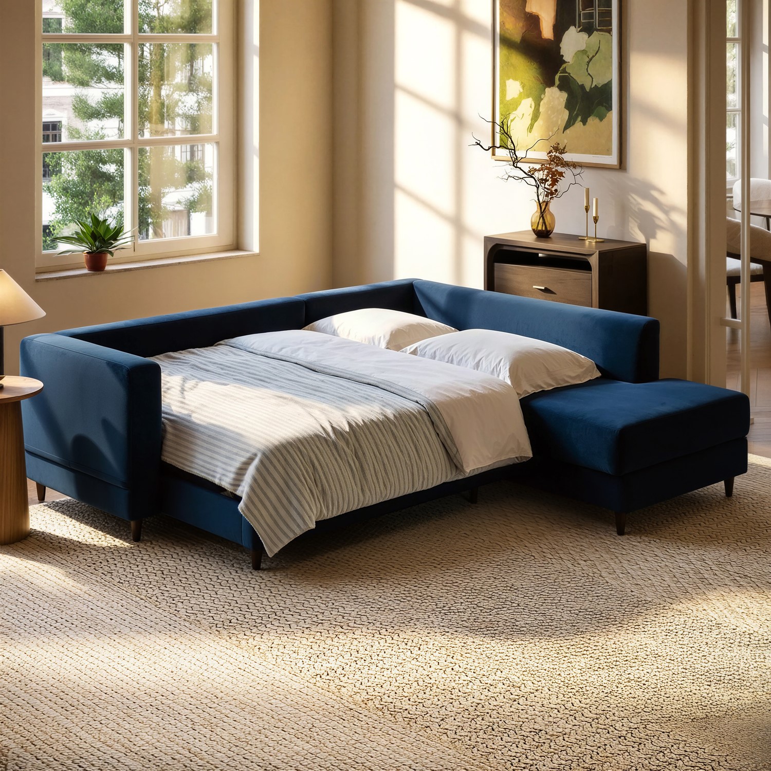 - Navy velvet right hand corner sofa bed with ottoman storage