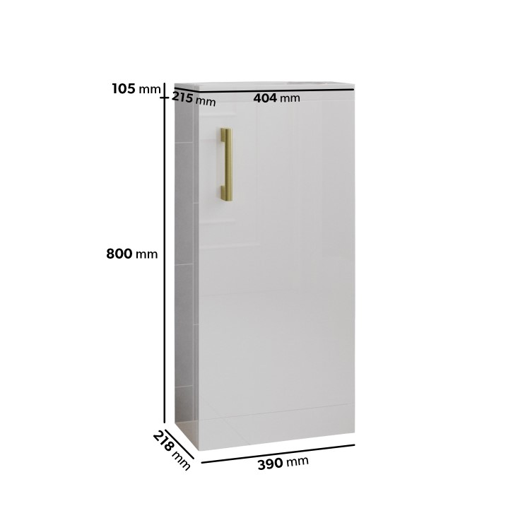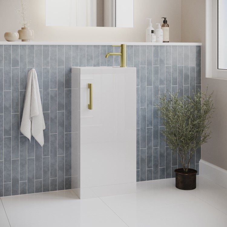 Update your bathroom with this modern Ashford freestanding 400mm vanity unit, finished in a clean white gloss. The vanity unit is equipped with a brushed brass handle for easy opening, and the white gloss finish instantly brightens your bathroom whilst being easy to wipe down and clean. This vanity unit makes brilliant use of smaller spaces with its 218mm depth whilst providing essential storage, making it perfect for ensuites or cloakrooms. Not only is the door opening configurable to suit either a left hand or right hand opening, the basin can also be fitted to suit your tap placement preference - either on the left or right hand side.