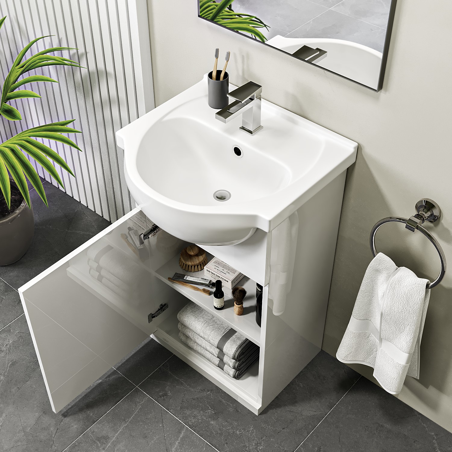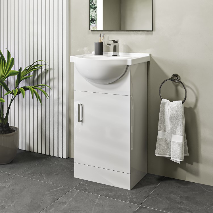 Elevate your bathroom with this modern floorstanding 455mm Classic white gloss basin vanity unit, designed to offer both style and everyday practicality. The clean, minimalist lines and reflective gloss finish create a bright, spacious feel, making it a perfect choice for modern cloakroom and en-suite bathrooms, alongside its space saving 455mm width. The semi recessed basin provides a luxurious curved design that sits comfortably within the unit while offering deep wash space and countertop space. The ceramic basin features a luxurious, crisp gloss-white finish that not only brightens your space but is designed for everyday practicality making cleaning quick and easy. It includes one central pre-drilled tap hole, making it suitable for a cloakroom mono basin mixer tap of your choice, and features a round chrome overflow cover to complete the look.