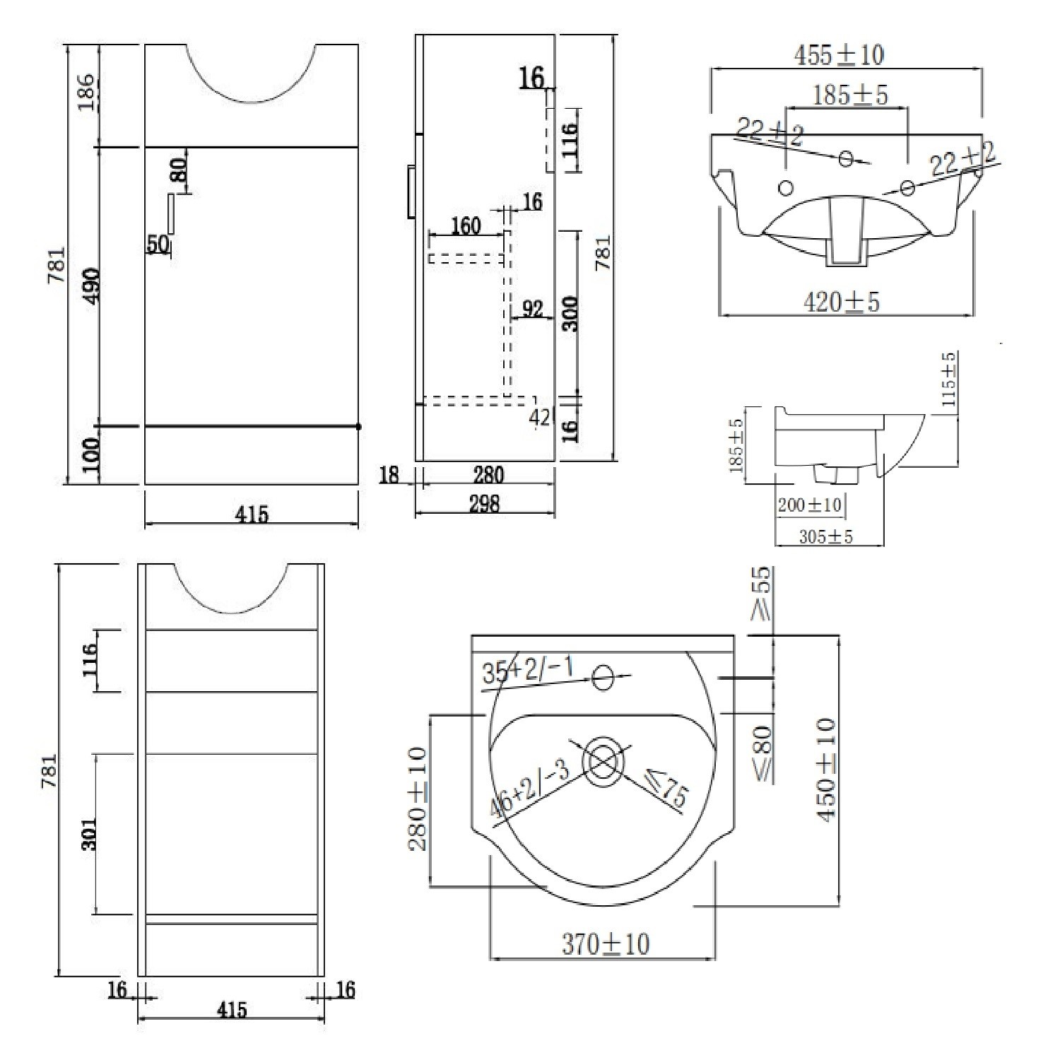 - Overall Basin Vanity Dimensions (including basin): H840 x W455 x D 460 mm (the vanity footprint is 415mm, however the basin overhang brings the total width to 455mm and depth to 460mm)
