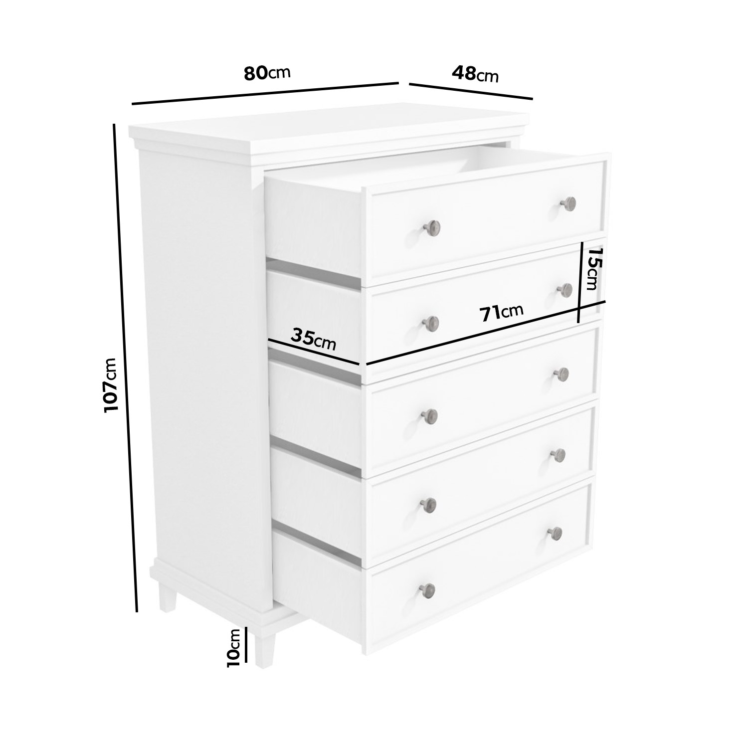 The Georgia 5 drawer chest offers great storage capabilities alongside a timeless and classic look. The shaker style design fits in with any home interior and the white painted finish gives you the option to add a pop of colour into your space to compliment it. Use this unit in your hallway or bedroom and save yourself some floor space. Better still, there is no assembly required as it comes fully built.